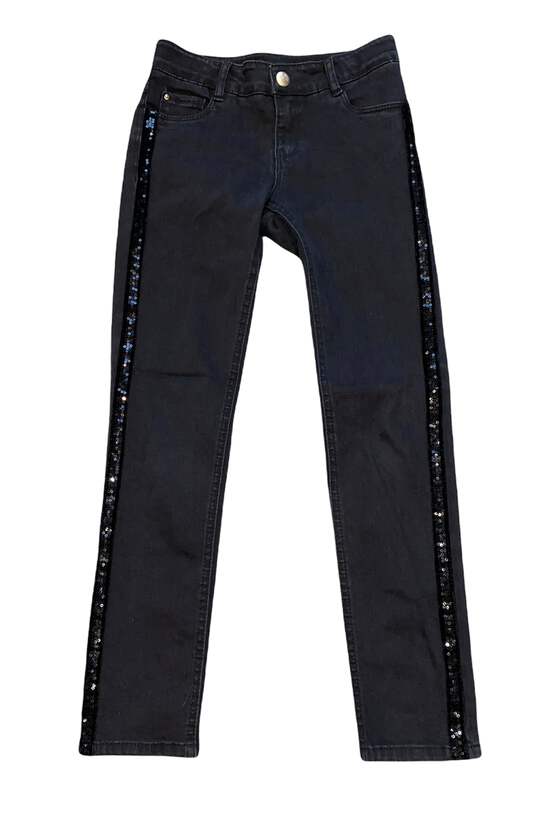 Ikks girls stretchy, skinny fit, black jeans embellished black sequin side panels size 10.