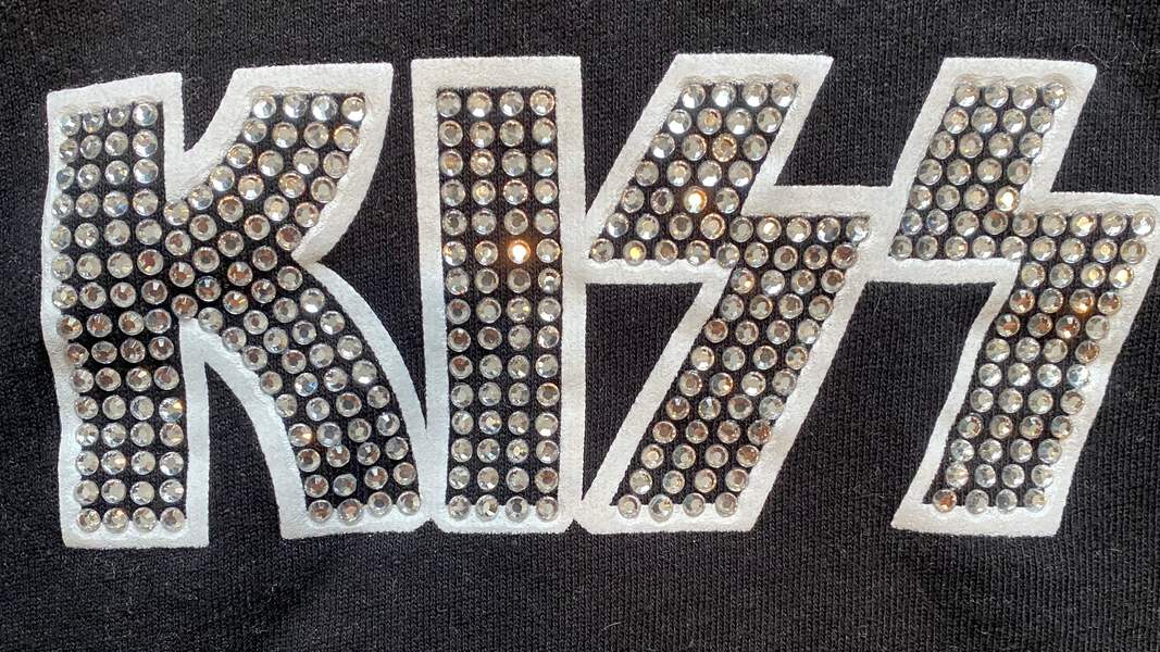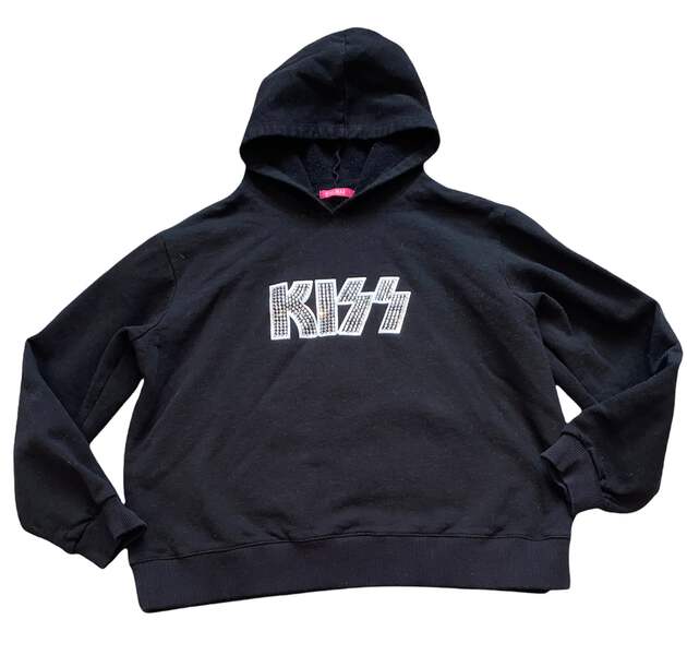 Me N U girls black pullover boxy hoodie with rhinestone KISS on front size youth XL(14) - may run slightly smaller 12? Measurements below