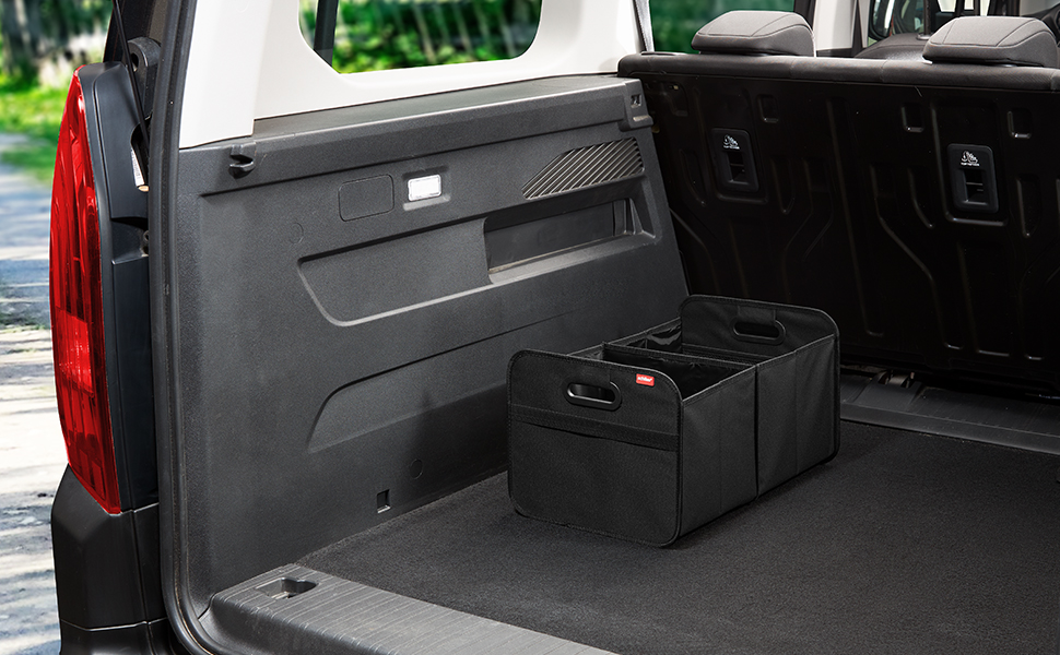 Mit dieser praktischen Faltbox verstauen Sie Ihre Einkäufe, Sportsachen, Autozubehör, Hunde-Utensilien, Werkzeug und vieles mehr sicher im Kofferraum. Keine herumfliegende Gegenstände mehr. Wenn diese Tasche gerade nicht in Gebrauch ist, falten Sie die Box platzsparend zusammen und verstauen sie im Kofferraum. Je nach Platzbedarf kann eines von den beiden geräumigen Fächer zusammengefaltet werden. Ein optimales Autozubehör für jeden Kofferraum. Der Auto-Organizer ist durch die verstärkten Wände äußerst robust und stabil. Aufgrund des pflegeleichten Polyesters ist diese Kofferraumtasche sogar wasserabweisend und bei Verschmutzungen leicht mit einem feuchten Tuch zu reinigen.