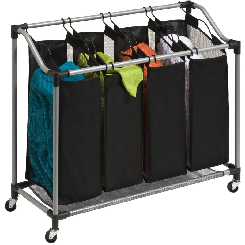You've got the fancy bar cart, the mid-century modern credenza now you can shine up your laundry game too with this sleek Quad Laundry Sorter with black mesh bags. Glowing amid your dirty clothes like a beacon of style, this modern laundry hamper effortlessly glides from room to room while helping you separate your whites, darks and gold lame loungewear. The breathable black mesh bags keep you breathing a little more fabulously on chore day. Both functional and fancy, this 4 bag laundry sorter has enough moxie to wear designer clothes and separate all the ones that need washing.
