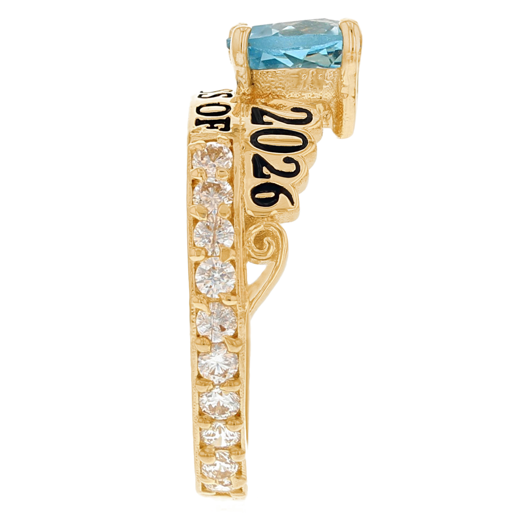 An exquisite Heart shaped Simulated Aquamarine is prong set at the center of this Class of 2026 graduation ring. The stone is a perfect accent to the piece and adds a personal touch since it is the color of the recipient's birthstone! Additionally, white CZ are set along most of the band, creating a stunning look that is sure to turn heads. Only fine 10k or 14k Yellow Gold is used to craft this fine piece of jewelry. Show that graduate in your life how important their milestone is with this elegant graduation ring. Aqua is the the birthstone for the month of March and represents courage, creativity, health, perception and hope. Our rings are proudly handcrafted in our California factory.
