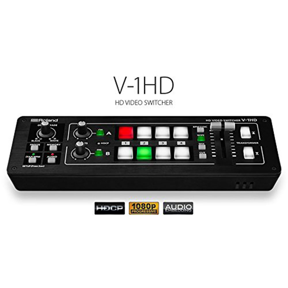 Roland's V-1HD 4 x HDMI Input Switcher is a portable solution for HD video production that accommodates up to four HD inputs. The inputs each have a frame buffer/TBC so you don't need to genlock your input sources together. You can control the switcher manually by using the built-in controls, or connect it to a computer or iPad running optional software for electronic control. Select your working resolution and switch between your four input sources. Built into the switcher is a 12-channel audio mixer which can de-embed and embed audio signals from HDMI.