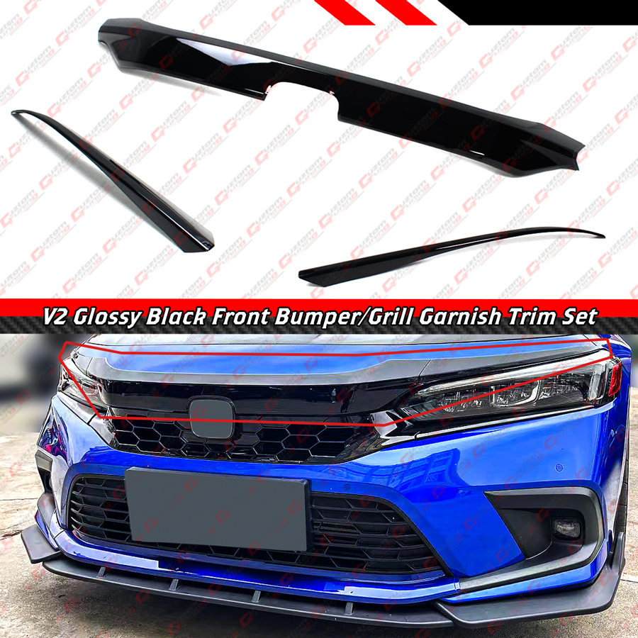 - JDM V2 Design Front Upper Bumper/Grill Molding Trim Garnish Covers Kit. (One Middle Piece + 2 Upper Eyelid Pieces Above The Headlights). This is The V2 Style, Which has Bigger Coverage and Curve Design.