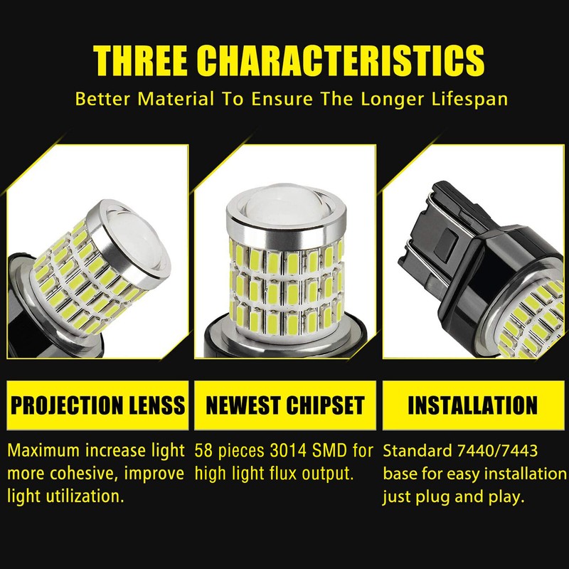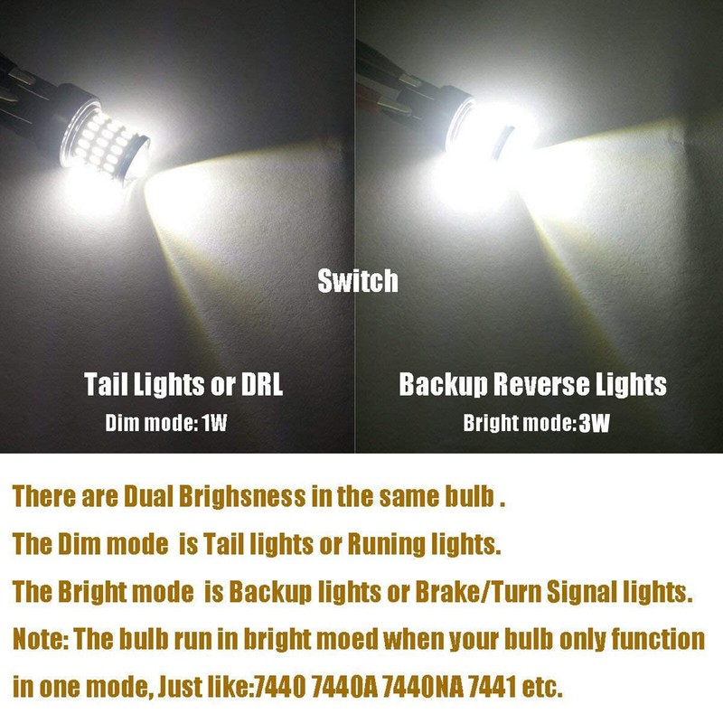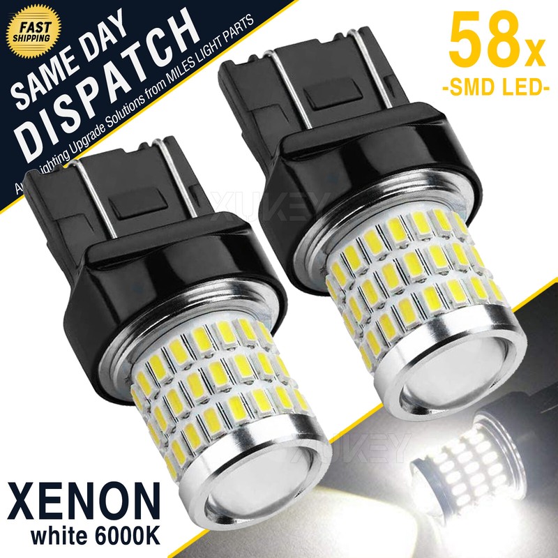 2x T20 580 7443 Top Quality LED Bulbs Daytime Running Sidelight Drl Xenon Xenon White W21/5W Specification: Lights Color: Xenon White (6000K) Compatible with these cross reference numbers: 7440 7441 7443 7444 7440A 7443A 992 T20 W21W 7440NA 7443NA 7442NALL 7443LL 7443ST 7443ULL 7444LL 7444NA 7444NA 7440-SACK 7440-SCK 7440-SRCK 7440AL 7440LL 7440ST 7442NALL 7443-SACK 7443-SCK 7443-SRCK WY21W W21/5W etc. Application: Turn Signal Parking Indicator light, Tail Stop Brake light, Reverse Backup light, Daytime Running Light DRL Incredibly Compact: Plug and Play, Polarity Free. Designed to connect to the same socket and electrical connector, fit perfectly in the same light housing as your original incandescent bulbs. Faster Rise Time: LEDs light up 0.2 seconds faster than incandescent bulbs. This is advantageous for brake lights because it can give the driver behind you an additional stopping distance - almost 18 ft. when driving at 60 mph. If the fitment chart says this item is not compatible with your vehicle, please contact us with your vehicle's Make/Model/Year/Trim which is helpful to check bulb type. Attention: There needs load resistor to avoid the turn signal fast blinking/hyper flash or error code on the dashboard for some vehicle Package composition: 2x 7443 LED Bulbs