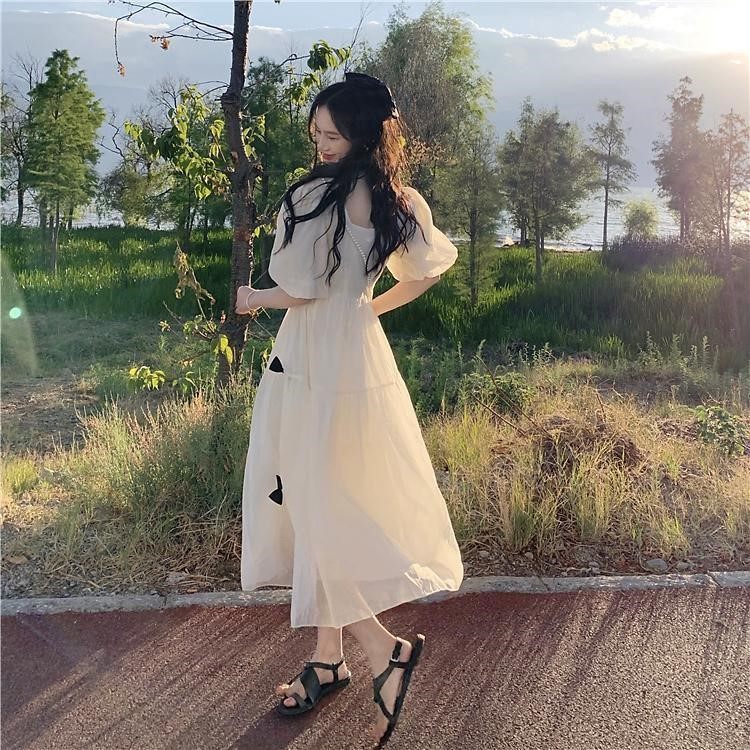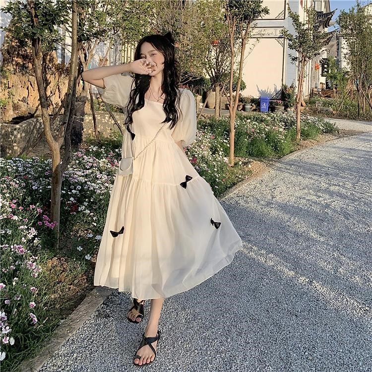 Junior High School Graduation Party Women Princess Chiffon College Dress Long Sweet Vintage Clothes Bubble Sleeve Beige Purple