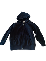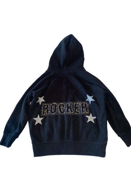 Custom toddler girls black zip hoodie on a soft Independent Trading Co sweatshirt and ROCKER on back embellished in studs and rhinestones, with silver glitter hearts size 4T.