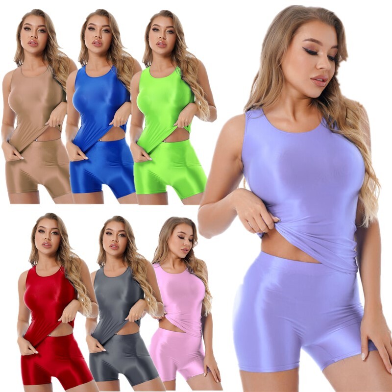 Glossy bodysuit, solid color, round neck, sleeveless, high cut design, backless.
