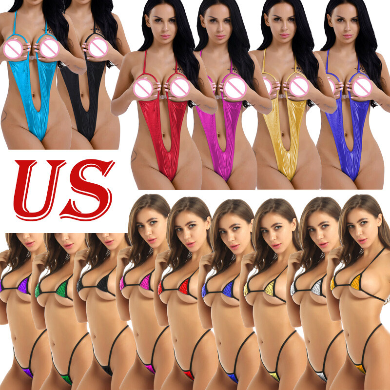 Womens Glossy One-piece Bathing Suit Backless High Cut Bodysuit Beachwear.