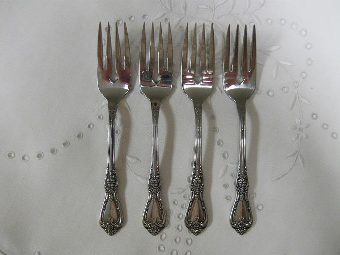 Here's 4 beautiful Oneida stainless steel salad forks from the Kennett Square pattern. Stamp on back side reads "Distinction Deluxe Stainless by Oneida HH". Length measures 6-1/4". Overall, these forks are in very nice condition showing minimal wear from use and storage. Please take a look at the photos and email me if I can answer any questions.