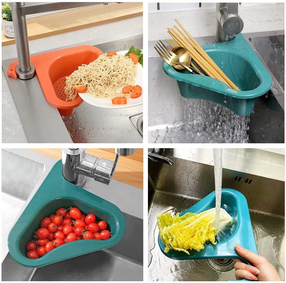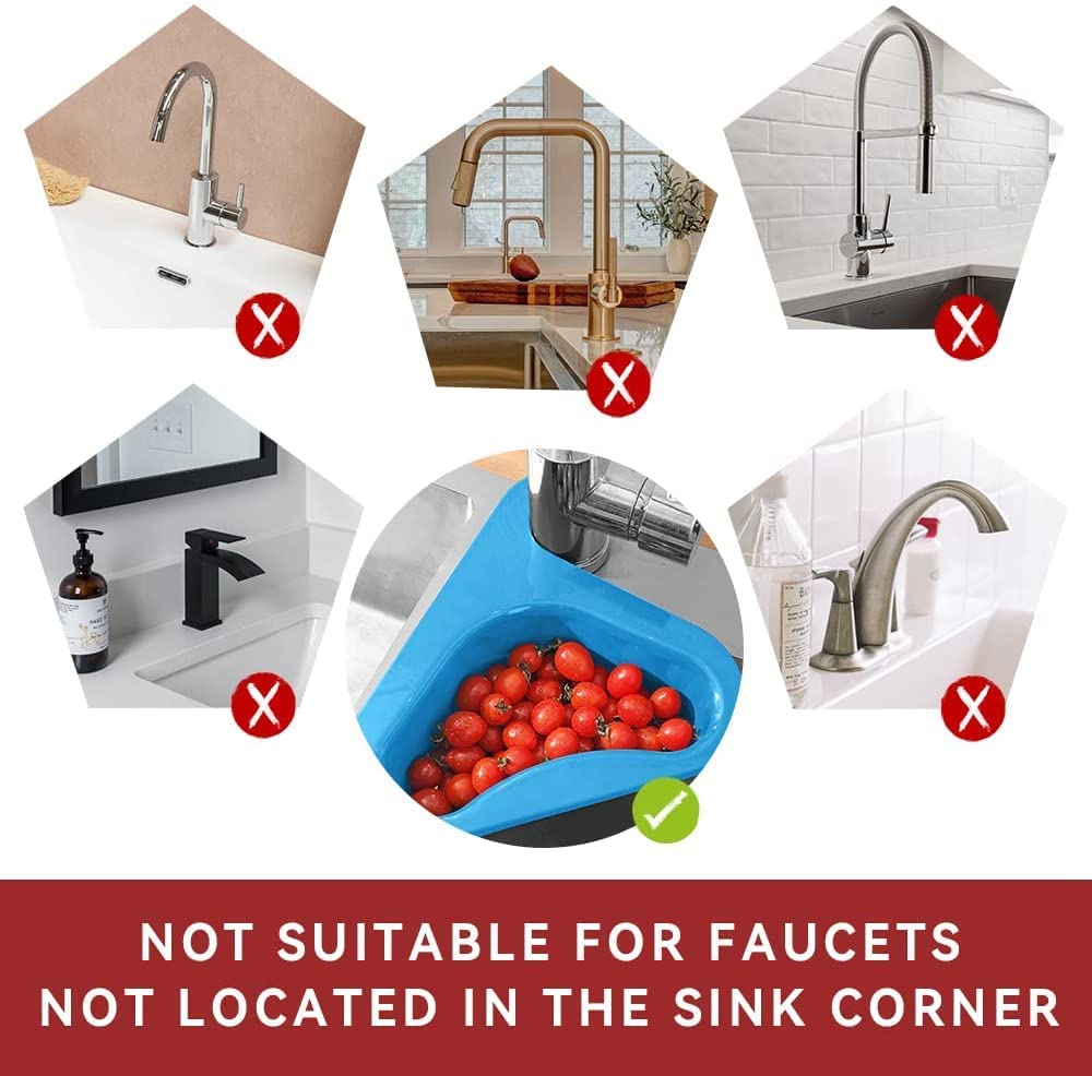 【Kitchen Sink Drain Basket】: Kitchen Corner Sink Strainer Basket,Multifunctional corner sink strainers for kitchen sink, Kitchen Triangle Sink Filter, Multi-Function Water Storage Tank Sink, Hangs on Faucet,Multifunctional Strainer, Leftover Hanging Rack Corner Food Kitchen. Please note: This Kitchen sink corner strainer basket only works on the newer, tall, kitchen faucets located in the sink corner.