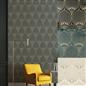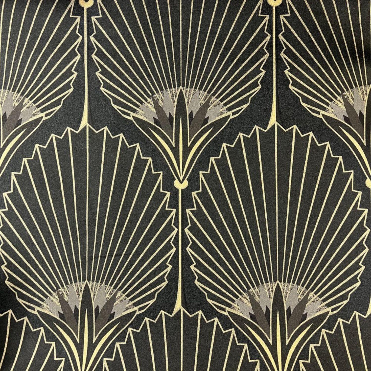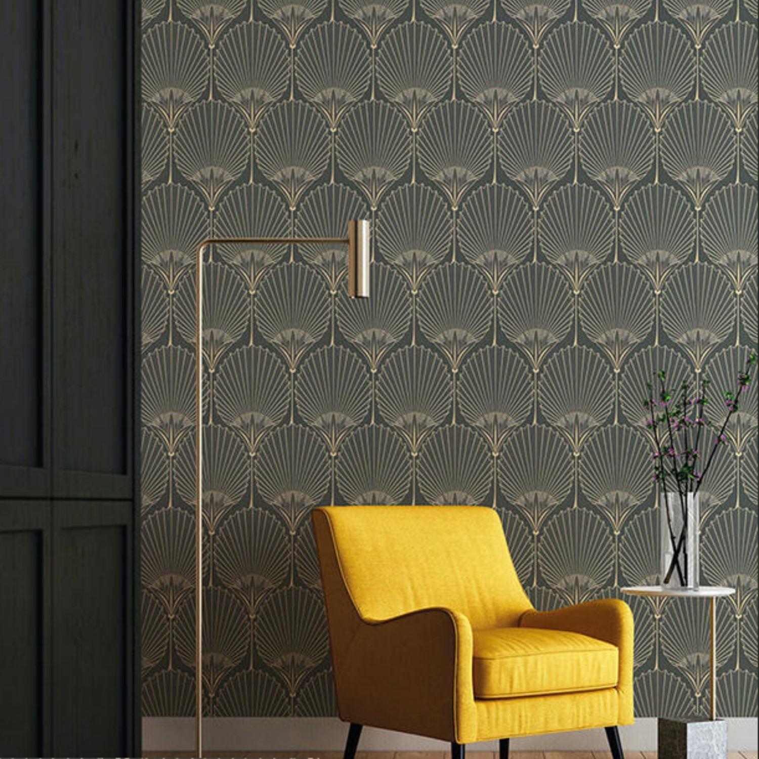 The beautiful Nile Palm wallpaper features a golden geometric palm motif. This Gatsby-style wallpaper comes in a sophisticated colour palette and boasts a subtle golden sheen.