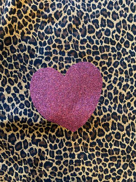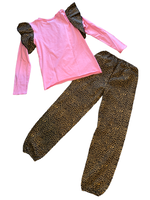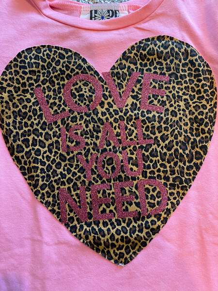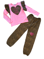 Hope Jeans girls 2pc set with pink long sleeve top, leopard flutter sleeves and matching leopard sweatpants. Top has Love Is All You Need in pink glitter text inside leopard heart, and sweats have matching pink glitter heart, size 12.