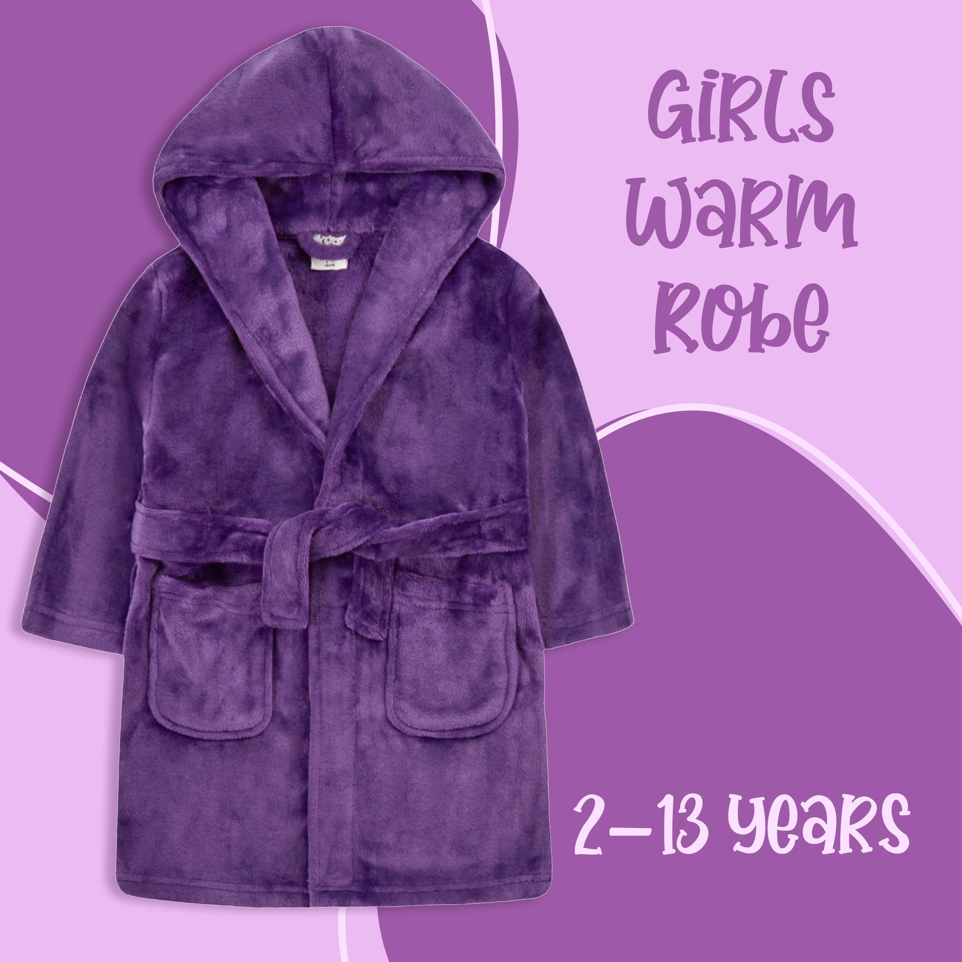 • COSY DRESSING GOWN - These Girls Dressing Robes are available in sizes: 2-3, 3-4, 4-5, 5-6, 7-8, 9-10, 11-12, 13 Years in lovely purple colour . Perfect to wear around the house as a loungewear, for pyjama parties and after bath.
