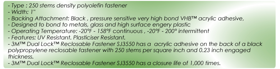 3M SJ3550 Dual Lock Reclosable Fasteners Adhesive Backing Color: White, Lock Side Color: Black Quantity: 1 Roll (Not Pair) for each order Each Roll Size(WxL): 1" Inch x 36" Inch (2.54cm X 91.44cm) **This product mates to itself, there are no male & female sides. **Please note that the original packing is 150' ft/Roll , we will cut it and manual rewind with the size your ordered. |