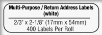 These Brother DK1204 Multi Purpose Address Labels 2/3” (17mm) make an easy way to add a professional feel to your correspondence for your home or business. Instead of manually writing your return address on each letter, make things much easier by printing in your choice of fonts and even logos on these high quality white labels. They are even pre-sized to fit common shapes used in mailing and office settings. Size: 2/3” x 2/18” (17mm x 54.3mm) Box: 400 Labels Per Roll Shipping: Item ships quickly - speedy delivery! Used With: QL500, QL550, QL570, QL580N, QL650TD, QL700, QL710W, QL720NW, QL800, QL810W, QL820NWB, QL1050 QL1060N  Looking for a different label? We always have DK labels in stock at low prices, simply click on a SKU number below to see pricing or place an order! | | | DK Labels for Brother QL Printers | | SKU | Description | Size | | DK1201 | Standard Address Labels, Roll/400 | 1-1/7" x 3-1/2" | | DK1202 | White Shipping Paper Labels, Roll/300 | 2-3/7” x 4” | | DK1203 | White File Folder Labels, Roll/300 | 2/3” x 3-7/16” | | DK1204 | Multi Purpose/Address White Labels, Roll/400 | 2/3” x 2-1/8” | | DK1207 | CD/DVD Film Labels, 100/Roll | 2-1/3” diameter | | DK1208 | Large Address Labels, Roll/400 | 1-1/2” x 3-1/2” | | DK1209 | Small Address Labels, 800/Roll | 1-1/7” x 2-3/7” | | DK1218 | Round Paper Labels, 1 In. 1000/Roll | 1” diameter | | DK1219 | Round Paper Labels, 1/2 In. 1200/Roll | 1/2” diameter | | DK1221 | Square White Labels Labels, 1000/Roll | 1" Square | | DK1234 | Self Adhesive Name Badge Labels, 260/Roll | 2-3/10" x 3-2/5" | | DK2113 | Continuous Clear Film Label, 50 Feet | 2-3/7” x 50 ft | | DK2205 | Continuous Length Paper Tape, 100 Feet | 2-3/7” x 100 ft | | DK2210 | Continuous Length Paper Tape, 100 Feet | 1-1/7” x 100 ft | | DK2211 | Continuous White Film Label | 1-1/7” x 50 ft | | DK2212 | Continuous Length White Film Label | 2-3/7” x 50 ft | | DK2214 | Durable Continuous Paper Tape | 1/2” x 100 ft | | DK2606 | Continuous Yellow Film Label | 2-3/7” x 50 ft | | DK4205 | Removable Continuous White Paper Tape, 1/Roll | 2-3/7” x 100 ft | | DK4605 | Removable Continuous Yellow Paper Tape, 1/Roll | 2-3/7” x 100 ft | | DK Labels for QL1050, QL1060N Printers Only | | DK1240 | Large Multi-Purpose Labels, Roll/600 | 4” x 2” | | DK1241 | Large Shipping Labels, Roll/200 | 4” x 6” | | DK2243 | Continuous Length White Paper Tape, 1/Roll | 4” x 100 ft | | | What are die-cut printer labels? Brother offers die-cut (pre-sized) drop-in printer label rolls for your convenience. These pre-sized Brother labels are cut into common label shapes used for mailing and in the office environment. | | |