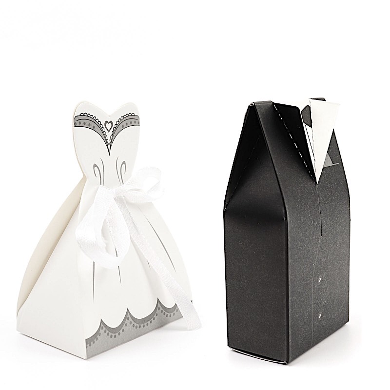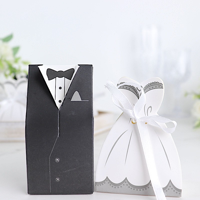 There are 25 wedding dress boxes, 25 Tuxedo favor boxes and 25 ribbons.