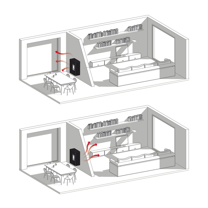 Die Matilde wurde speziell für kleine Räume mit reduzierten Abmessungen und einer schlanken Linie entwickelt. in einer trennwand von zwei räumen montiert, kann sie so genutzt werden, dass sie die wärme auf einem raum von etwa 60 m3 exklusiv weiterleitet. in der praxis wird durch einstellen des ventilators entschieden, welcher der beiden räume exklusiv weiterleitet die Hitze; Der Ofen, in dem sich der Ofen befindet, wird ausschließlich durch die vom Ofen selbst abgestrahlte Wärme erwärmt.