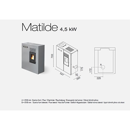 Nach dem Inkrafttreten der neuen europäischen Vorschriften zur Beseitigung giftiger Verbrennungsrückstände sind alle Eva Calòr-Produkte mit der Energieklasse A + und den Sternen zertifiziert, was die Einhaltung der Vorschriften widerspiegelt. Der Matilde-Ofen hat 4 Sterne; Darüber hinaus sehen wir die anderen Spezifikationen: