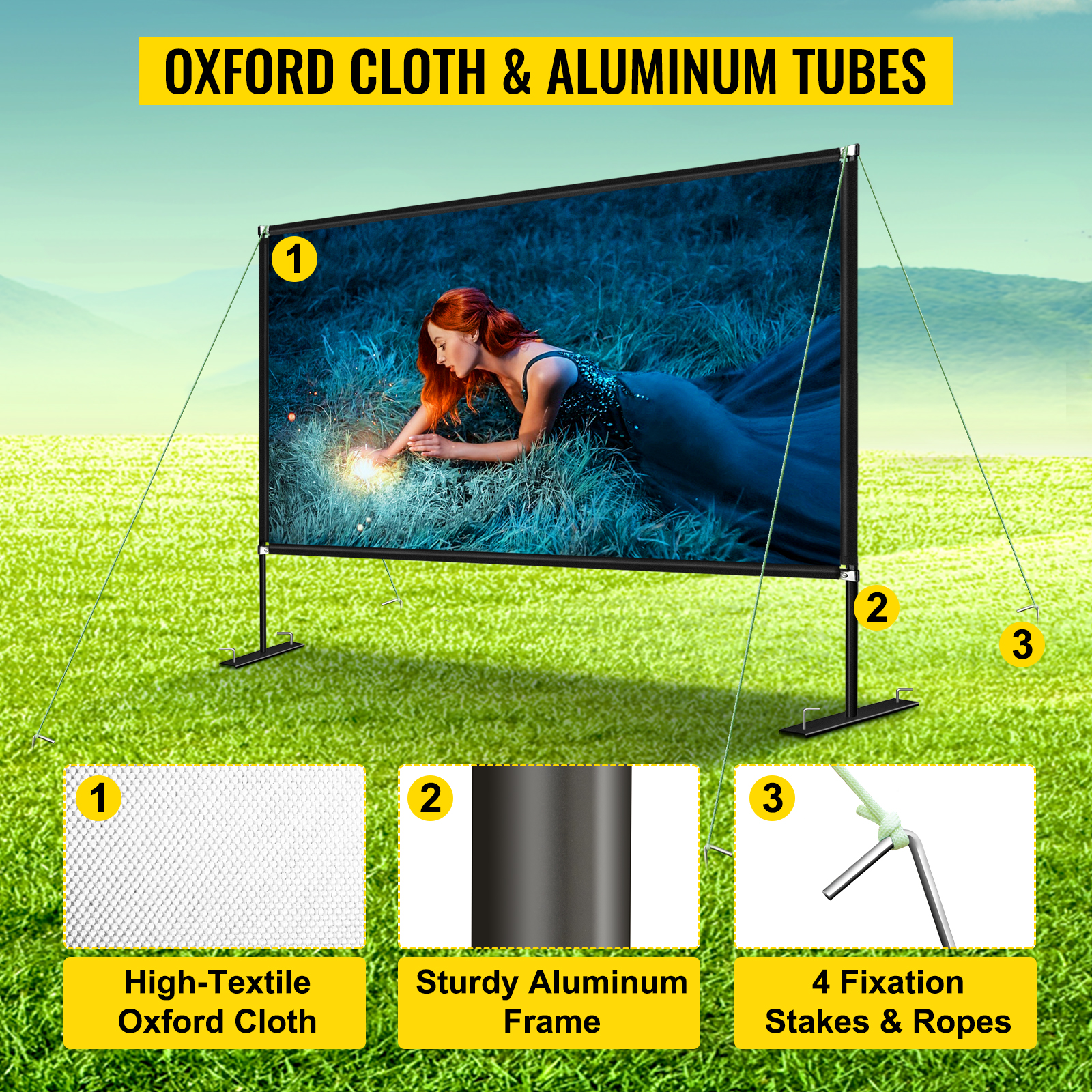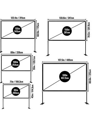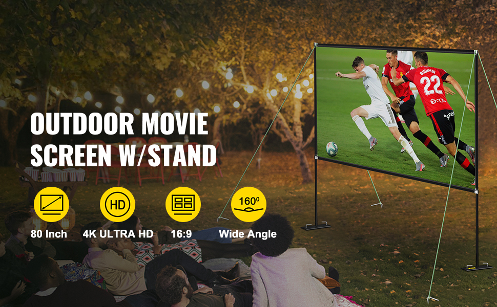 The movie screen for outdoor use features 16:9 high definition and a 160-degree wide viewing angle. The upgraded high-textile oxford cloth can get better photosynthesis and more clearer projection. It’s easy to install and portable anywhere. You can enjoy movable cinema at home, outdoor, hotel, ceremony, etc.
