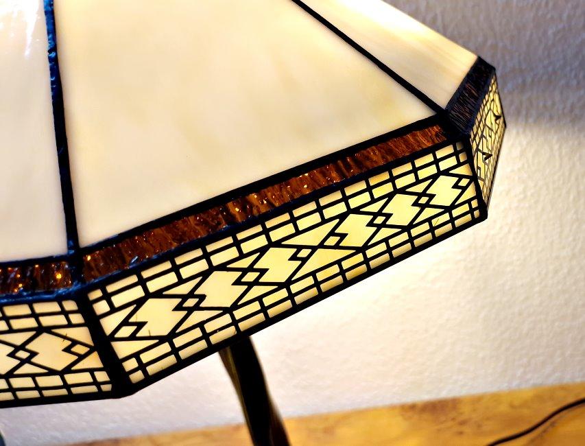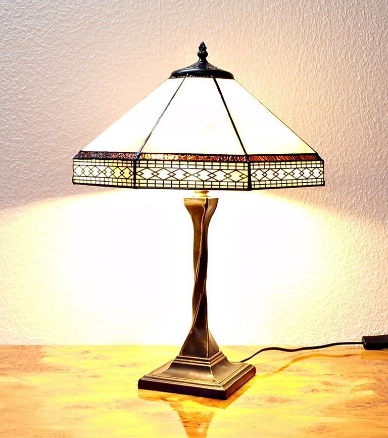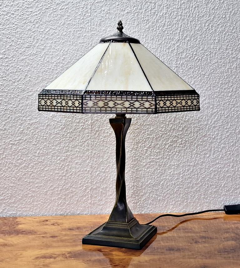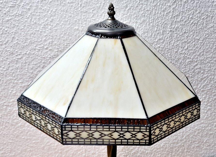 Tischleuchte Tiffany-Lampe. Echtes Tiffany Glas. Diese Tiffanylampe ist ca. 59 cm groß, der Durchmesser des Schirms beträgt ca. 40 cm. Die Beleuchtung dieser Tiffanyleuchte erfolgt durch zwei Glühlampen E27 mit LED 1 - 9 W warmes Licht nach Wahl. Unsere Lampen sind für alle Arten von Leuchtmitteln geeignet. Glühlampen, Sparlampen und LED-Lampen haben unterschiedliche Stromverbrauchswerte. Wir empfehlen die Verwendung von energiesparenden LED-Lampen mit warmem Lichtton. Gewicht: ca. 4,1 kg / Versandgewicht ca. 6,6 kg inkl. Verpackung. Leuchtmittel sind nicht enthalten. Die Bilder zeigen die gleiche Lampe jeweils beleuchtet und unbeleuchtet.