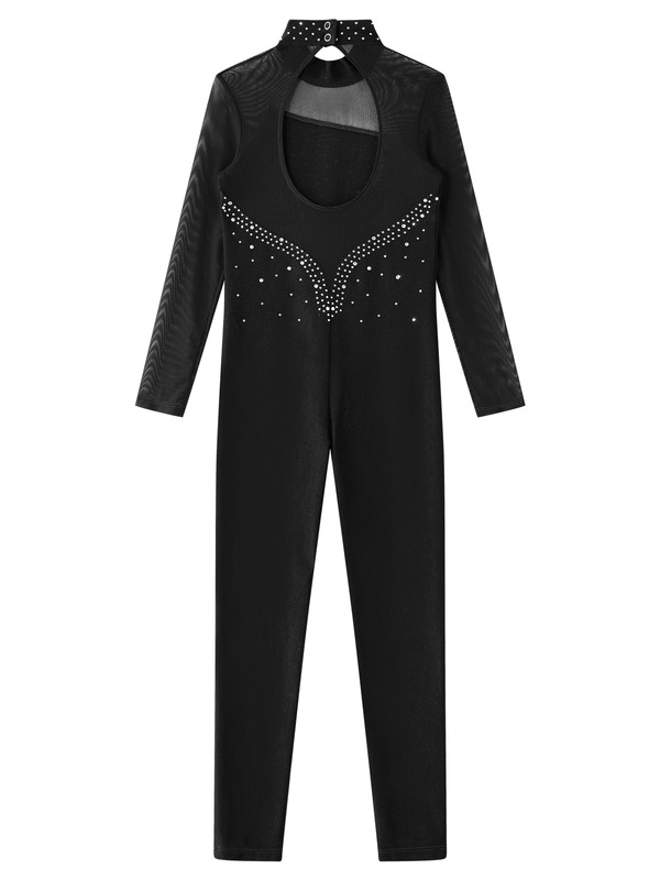 Girls One Piece Dance Unitard Rhinestone Long Sleeve Skating Jumpsuit Leotard