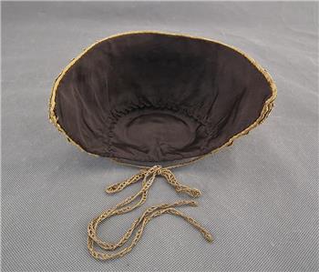 This magnificent Kupka is finely embellished in the highest quality of Spanier Arbeit (lace technique considered exclusive to Ashkenazi Jewish production). With goldwork embroidery of intricate patterns with gold-wrapped threads and bullion on brown silk velvet and adorned with decorative appliques, silver foil, green and ruby color cut glass paste sequins, ribbed silk lining, and two gold braided flattened tying cords.