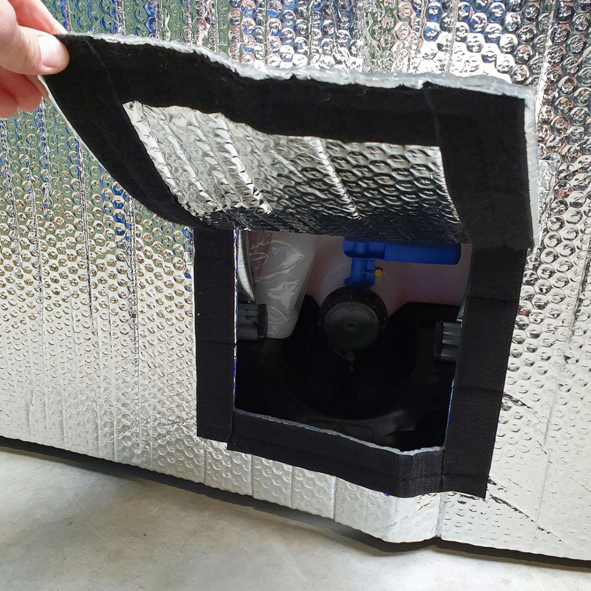 Die Luftpolsterung sorgt dafür, dass eisige oder warme Temperaturen draußen bleiben und nicht in den Container eindringen können. Jedoch hält die Thermohaube den Tank nicht dauerhaft frostfrei. Wir empfehlen hierfür die Nutzung einer IBC Heizmatte.