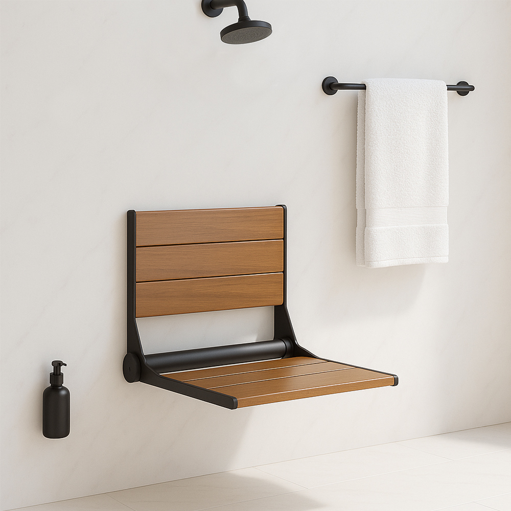 The Home Aesthetics18" Teak Wood Seat is a one person folding shower bench. Featuring a high strength easy close mechanism that allows the bench to fold up and stay up! Back rest is easily removable for easy cleaning of the tiles behind the backrest. Automatically fold up to store out of the way. No need to lock into place, a machined precision tension hinge prevents the seat from inadvertently falling down. Slim 3'' folded profile