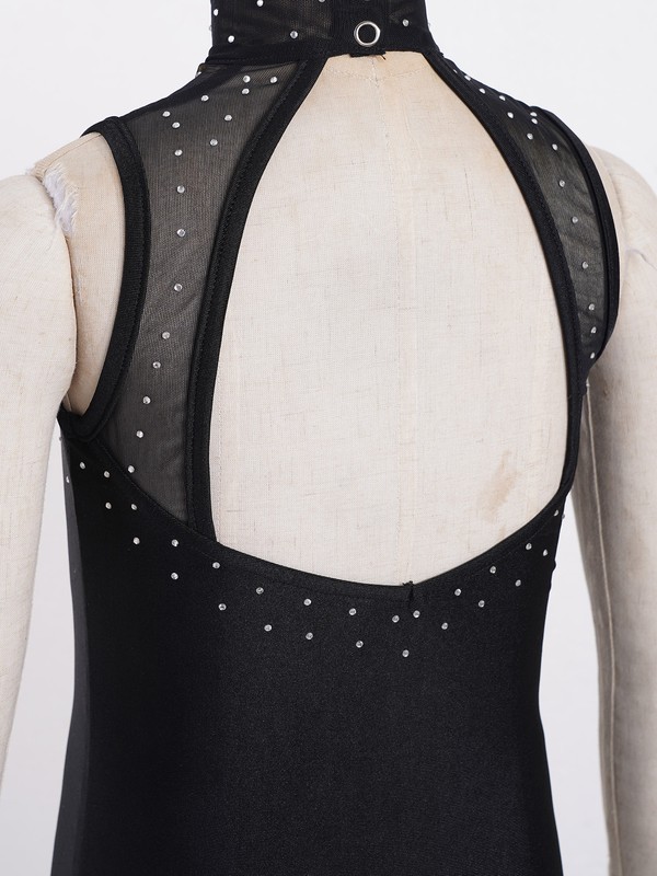 Kids Girls Mock Neck Sleeveless Open Back Faux Diamonds Adorned Mesh Patchwork Bodysuit.