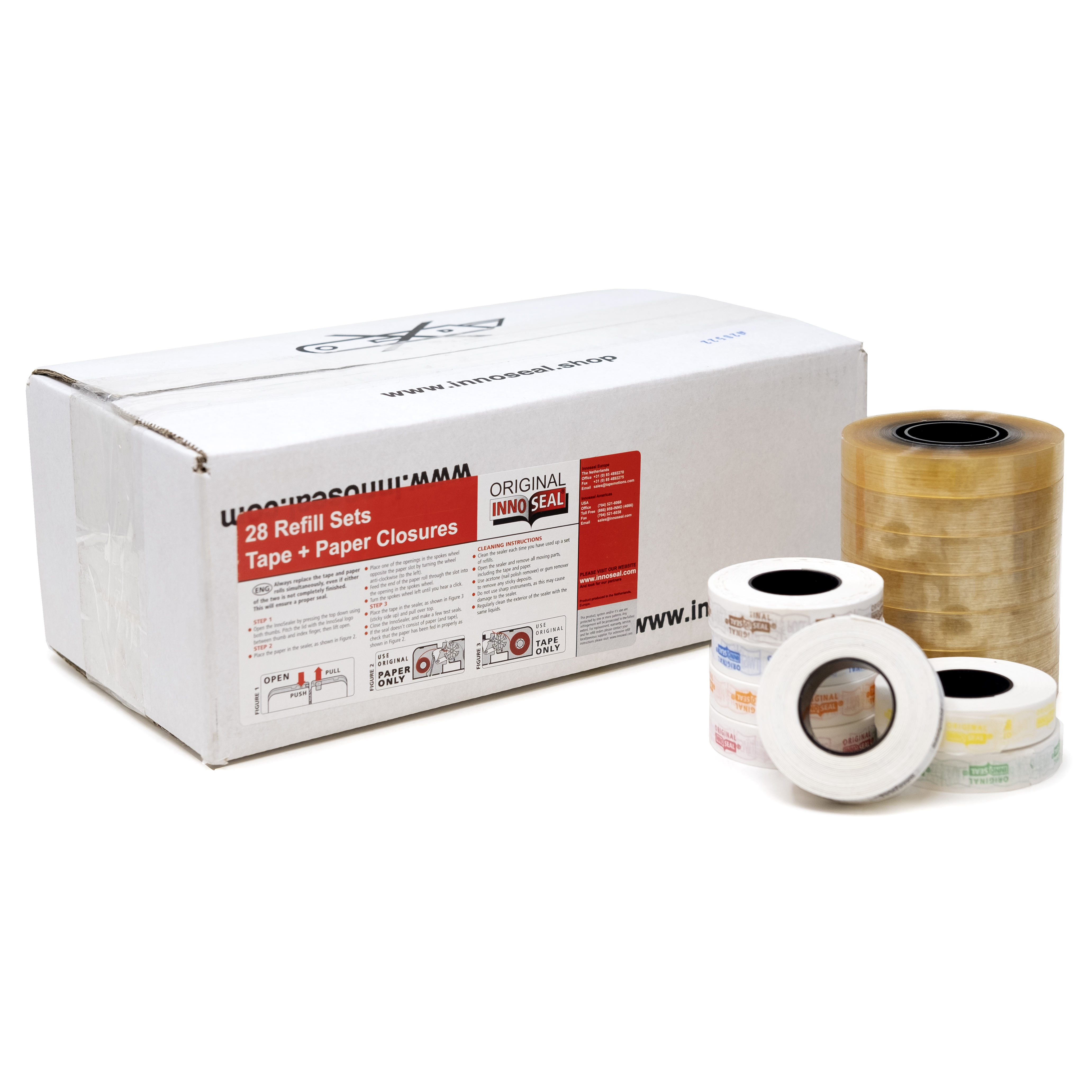 Refill tapes/multi-color paper seals for InnoSealer Bag Sealing Machine Model 15929. Seals poly, perforated, or poly-mesh combo bags holding up to 10 pounds of weight. Reduces landfill waste by more than 60% over twist ties and 90% over plastic tabs. Easy to load and use InnoSealer. Resealable paper seals safer than twist ties or plastic tabs. Contains 1 paper seal rolls of each day-of-the-week color for international food safety labeling: black, blue, yellow, red, brown, green, and orange. Also included are 7 rolls of clear tape.
