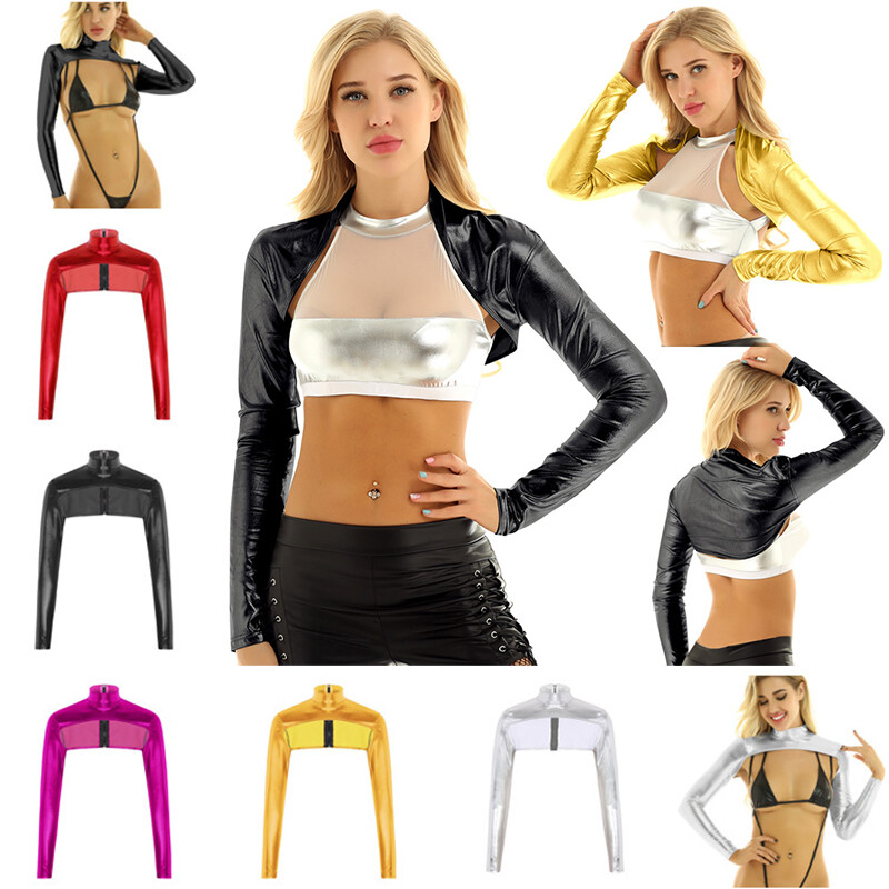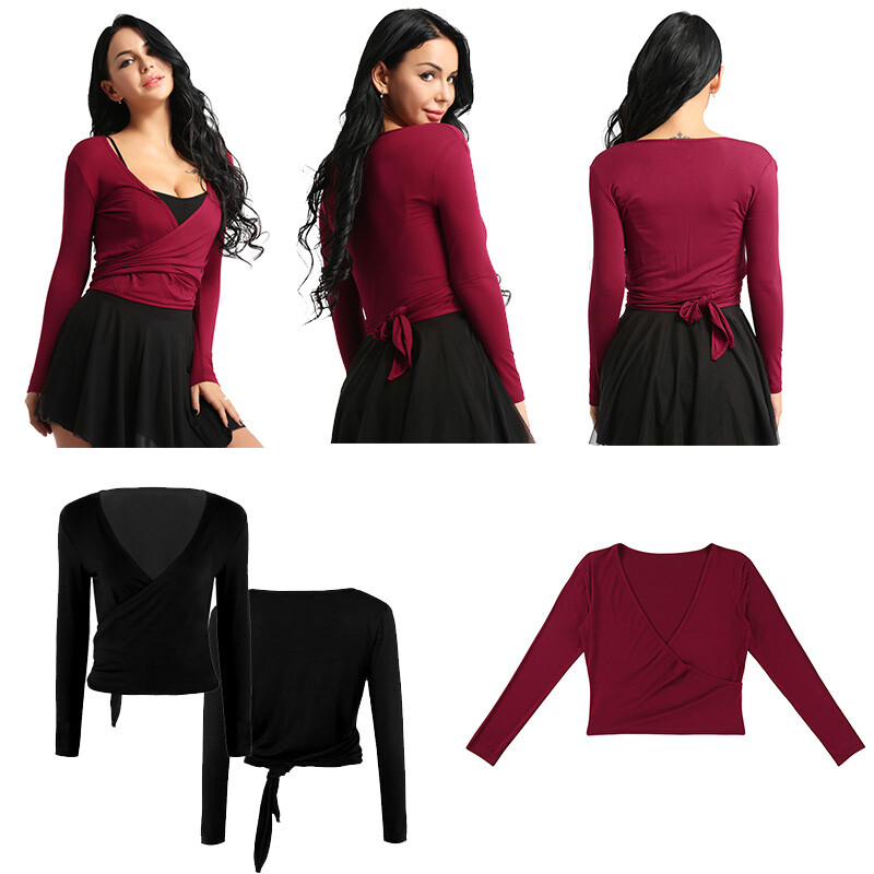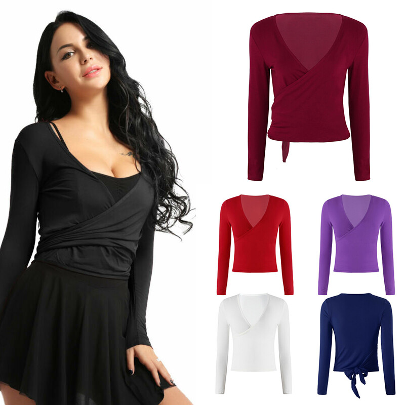Women Solid Color V Neck Long Sleeves Straps at Back Stretchy Crochet Dance Tops.