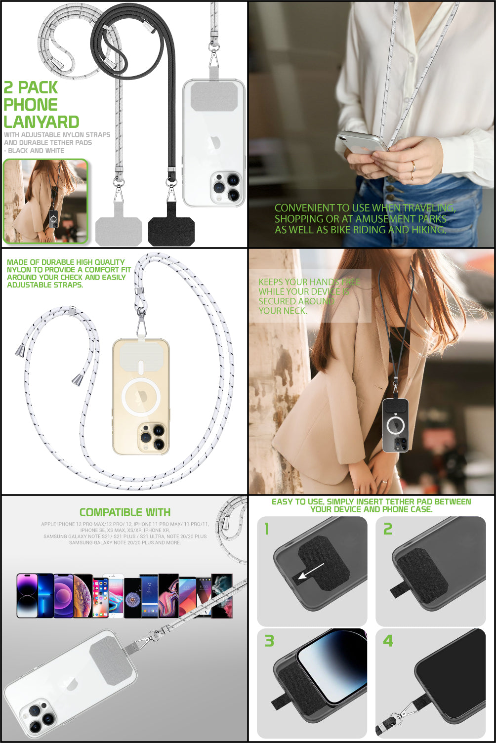This listing is for a brand new 2-pack of universal phone neck lanyards. Each lanyard features a durable and adjustable nylon strap for comfortable, hands-free carrying of your smartphone. The included ultra-thin tether pad is designed to fit discreetly between your phone and its case, providing a secure attachment point for the lanyard. This 2-pack is compatible with all smartphones that use a full-coverage case and allows you to keep your device accessible and protected from drops while on the go.
