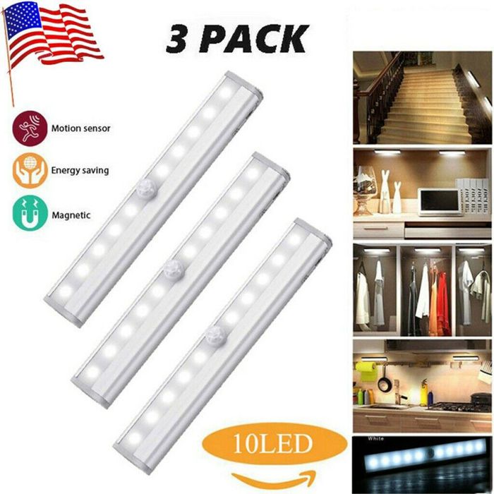 3PCS 10-LED PIR Motion Sensor Closet Lights Wireless Cabinet Night Light Lamp US
