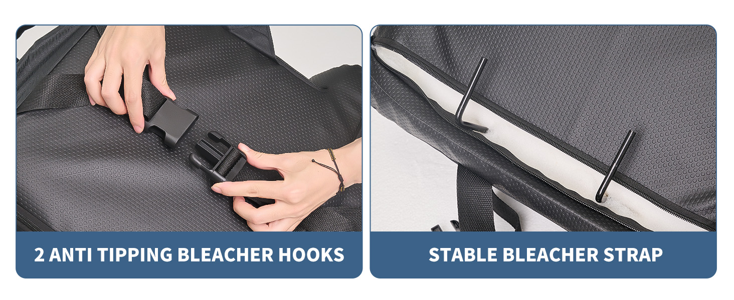 Easy to Carry: The stadium seats for bleachers comes with backpack straps, collapsible and portable, allowing you to take it anywhere. Our bleacher seats comes in 2 sizes, armrests up measures 16", if you think bleacher chairs is too narrow you can put the armrests down and the size is 21". You can also use hooks to fix bleacher seats with backs and cushion so that the seat is not easy to slide. (NOTE: The snap hooks are hidden inside the bottom zipper.)