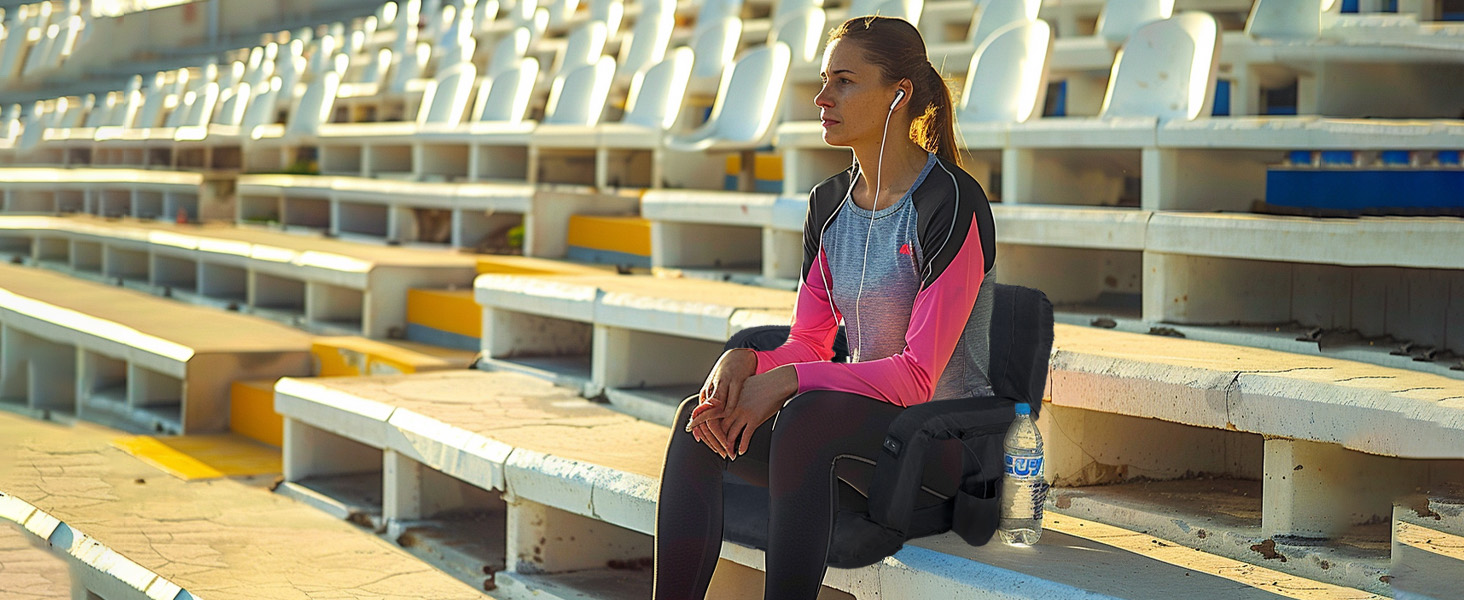 Soft and Comfortable: The stadium chairs for bleachers with back support is made of waterproof polyester and durable oxford cloth. A layer of PVC leather with raised particles is also added to the bottom of the seat, which is non-slip and easy to clean. The bleacher seat has a built-in soft high-density memory foam cushion to create a comfortable seat for you. And stadium seat is equipped with 6 reclining positions, which can be set to the most comfortable position.