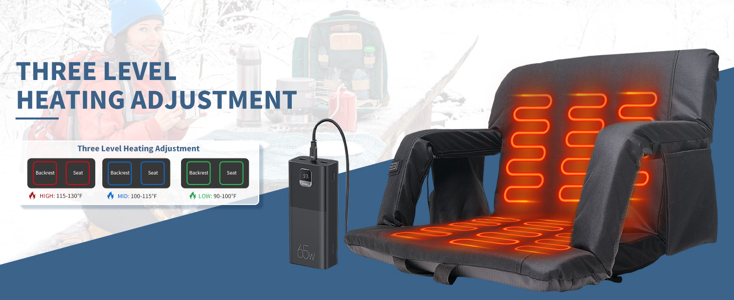 Heated Bleacher Seats: Our stadium chairs for bleachers with back support are heated by USB power. Press the temperature control switch to warm up the back and bottom of the heated seat. And the double heated stadium seat is divided into 3 heating modes, high, medium and low, and the max temperature can be heated to a max of 140°F. (Note: USB power bank is not included, and we recommend using a power supply above 10W.)