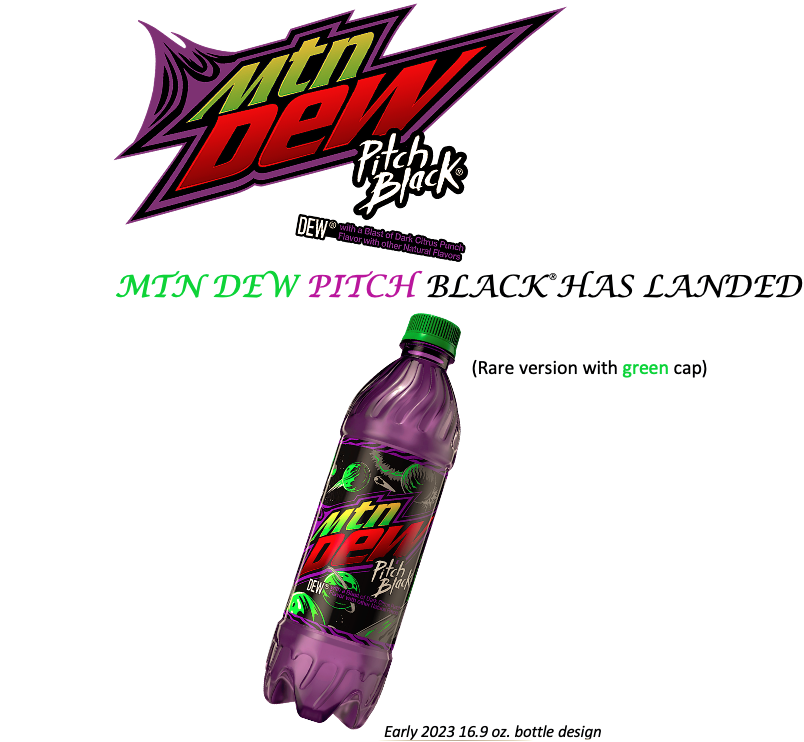 MTN DEW PITCH BLACK® are back on shelves for the first time since 2019! MTN DEW PITCH BLACK® is DEWwith a Blast of Dark Citrus Punch Flavor with Other Natural Flavors.