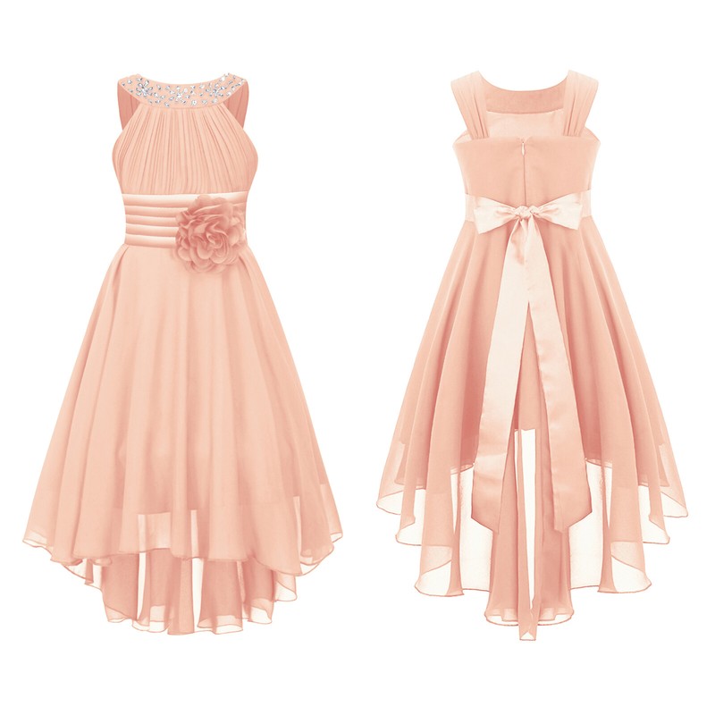 High-low chiffon hem with smooth lined, a pin-style 3D flower applique, this dress makes girls elegant and attractive.