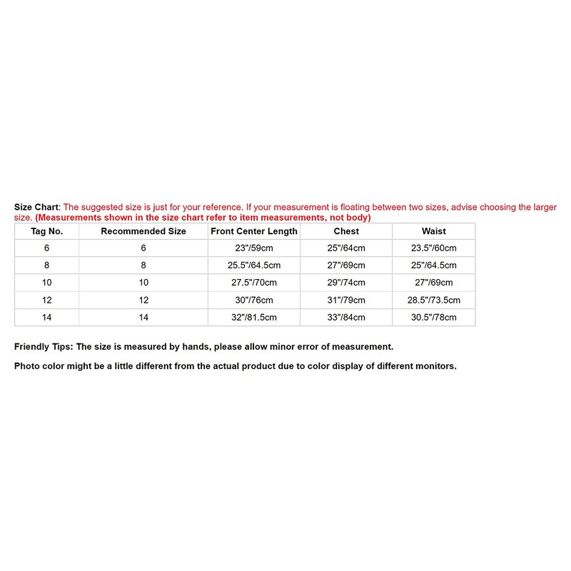 Size Chart: The suggested size is just for your reference. If your measurement is floating between two sizes, advise choosing the larger size. (Measurements shown in the size chart refer to item measurements, not body)