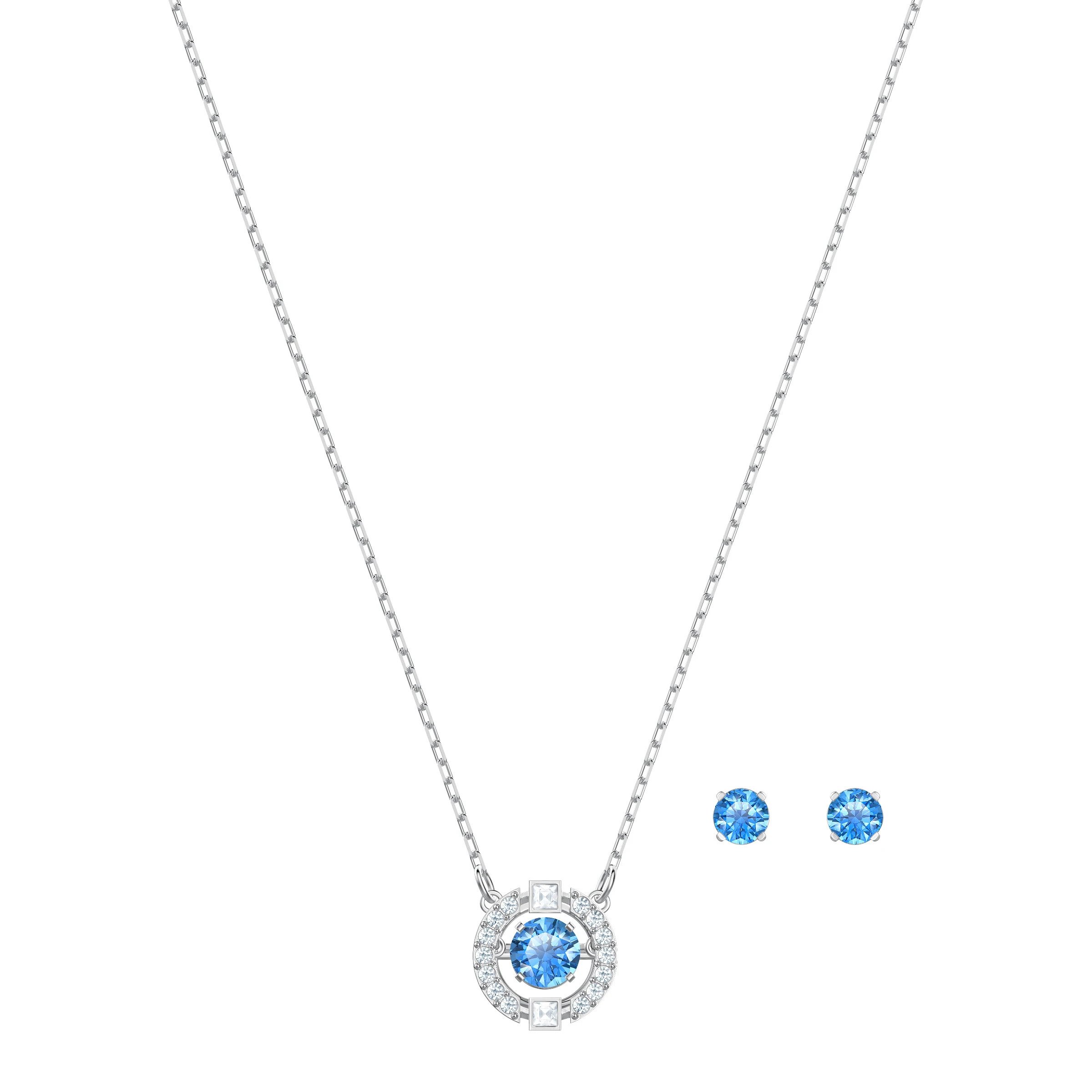 Present a thoughtful gift this Mothers Day with this timeless set which includes a pair of stud pierced earrings and a necklace. Refined and elegant it showcases Swarovskis innovative dancing crystal design concept with a circular motif in pave enclosing a floating sparkling pastel blue stone. Plated in rhodium it is luxurious with a playful touch. Size: 14 7/8 / 3/8 inches.