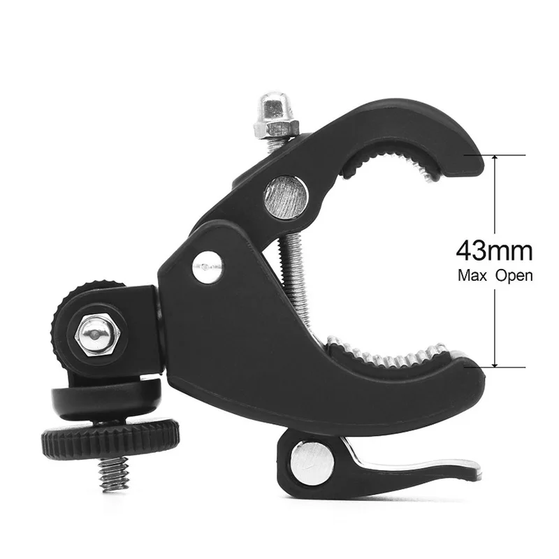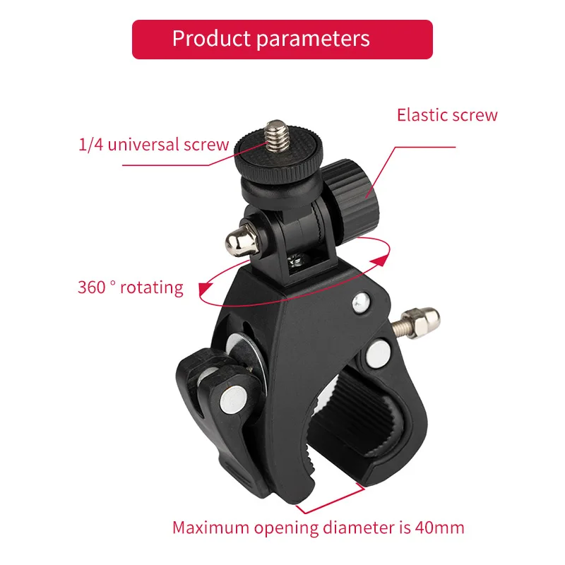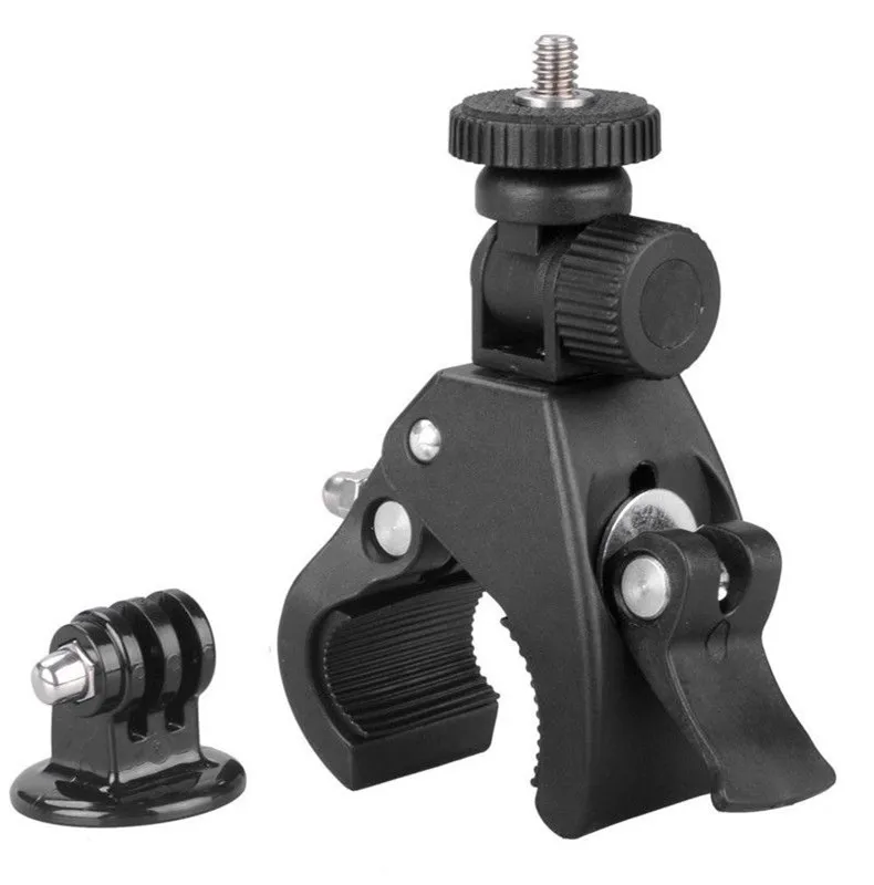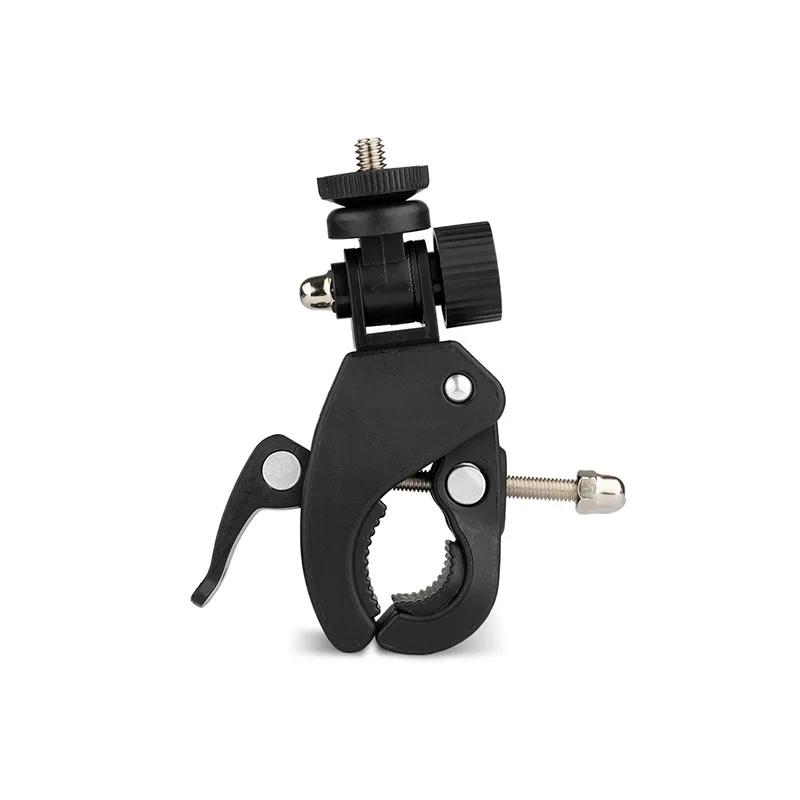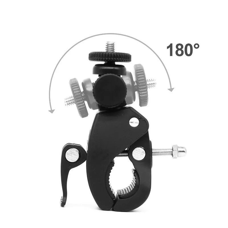 The camera clamp is mounted on the handlebar of the bicycle/motorcycle/scooter, and the DVR/digital camera/driving recorder can be screwed onto the clamp through its own fixing screw hole.