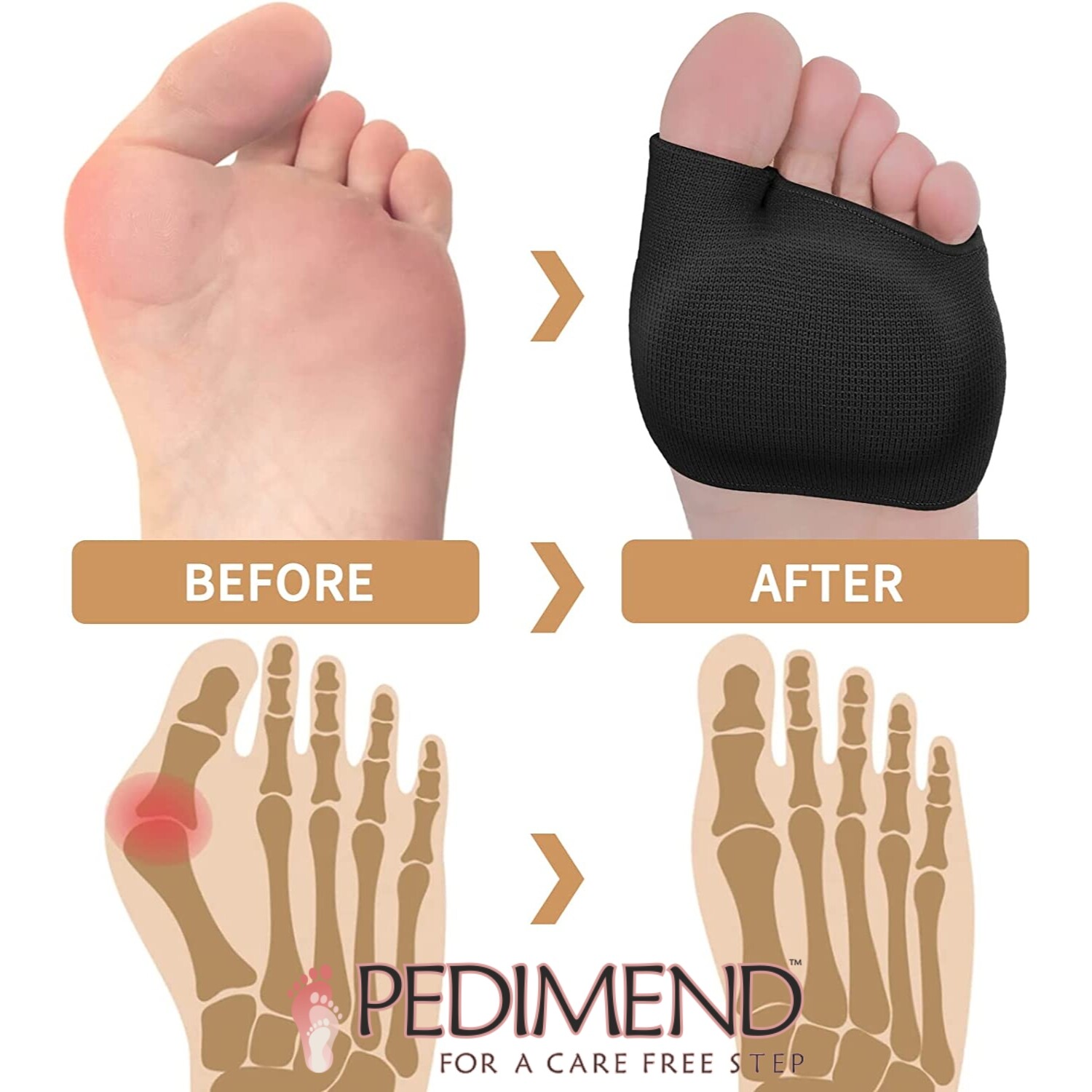 PRODUCT DESCRIPTIONThese Metatarsal Pads are Comfortable thin, elastic, breathable stretch poly fitted sleeve with an imbedded soft gel metatarsal pad to cushion the balls of your feet and give you relief all day long from Calluses, Morton's Neuroma, Rheumatism, and other fore-foot discomfort. Get your metatarsal pads and start relieving painful pressure caused by standing, running, jogging and being on your feet all day. BEST TREATMENT FOR ✓ Morton's Neuroma ✓ Sesamoiditis ✓ Blisters ✓ Callus ✓ Healing Fracture ✓ Post Surgery ✓ Broken Metatarsalgie ✓ Metatarsalgia ✓ Other Foot Pains FEATURES & BENEFITS OF USING THESE GEL SLEEVES ✓ Cushioning the forefoot with a gel-infused pad ✓ Absorbs shocks, reduces pain and friction with soft soothing gel pad. ✓ Elastic sleeve with a gel pad that covers all 5 metatarsal heads to reduce pain in ball of foot (Front of Foot). ✓ Ideal for giving protection and relief from corn and callus on the soles of the feet. ✓ Cushions, soothe and prevents calluses. ✓ Worn comfortably in everyday footwear. ✓ Washable & reusable design, for durable to use. HOW DO I TAKE CARE OF THEM? Our Material and gel TPE orthotic supports are easy to clean. They are washable and reusable as well! Just wash the sleeve with soap and warm water and let air dry. Avoid overstretching and exposure to sunlight to prevent discoloration. AVAILABLE IN 3 COLOURS BEIGE SIZE SMALL UK 3-6 LARGE UK 6-11 X-LARGE UK 8-13 PACKAGE CONTAINS ✓ 2PCS of Metatarsal Gel Pads. WHY PURCHASE FROM PEDIMEND? Why purchase from PEDIMEND, When others Look the same , FOR LESS?