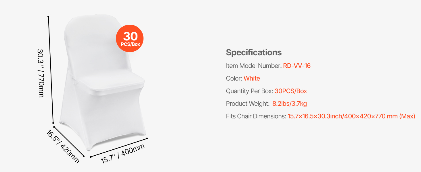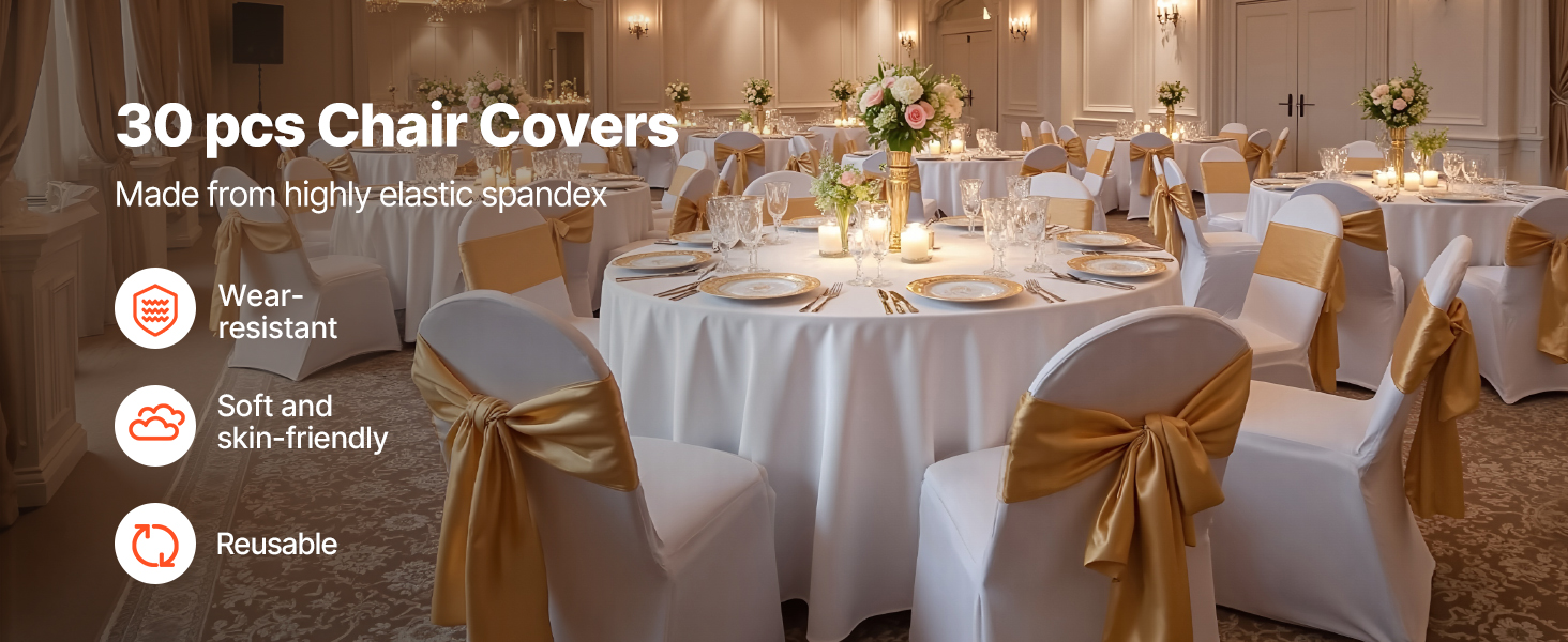 - High-Quality Material: Color: White; Box contains 30 pieces; Composition: 95% polyester fiber and 5% spandex. The sturdy fabric and reliable stitching provide enhanced comfort and flexibility. These versatile spandex chair covers are crafted to shield your chairs from spills, pet scratches, daily wear, and stains, making them suitable for use at both indoor and outdoor gatherings.