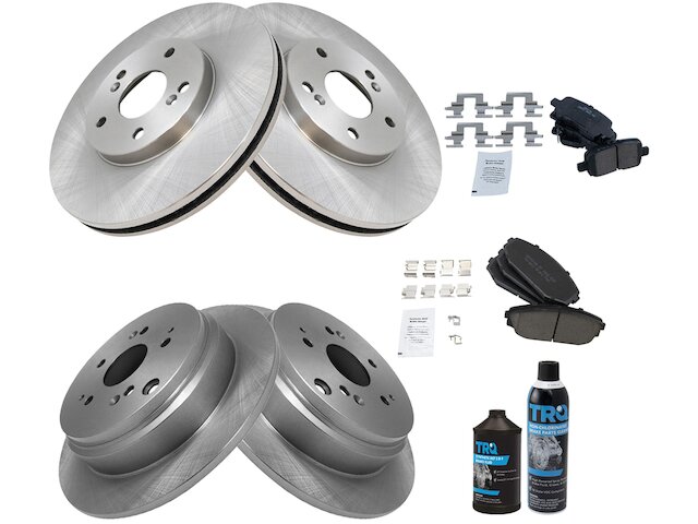 Package Contents: (2) Front Brake Rotors; (2) Rear Brake Rotors; (1) 12 oz DOT 3 & 4 Brake Fluid; (1) 13 oz Non-Chlorinated 50 State Formula Brake Cleaner; (1) Front Ceramic Brake Pad Set with Contact Point Grease & Hardware; (1) Rear Ceramic Brake Pad Set with Contact Point Grease & Hardware