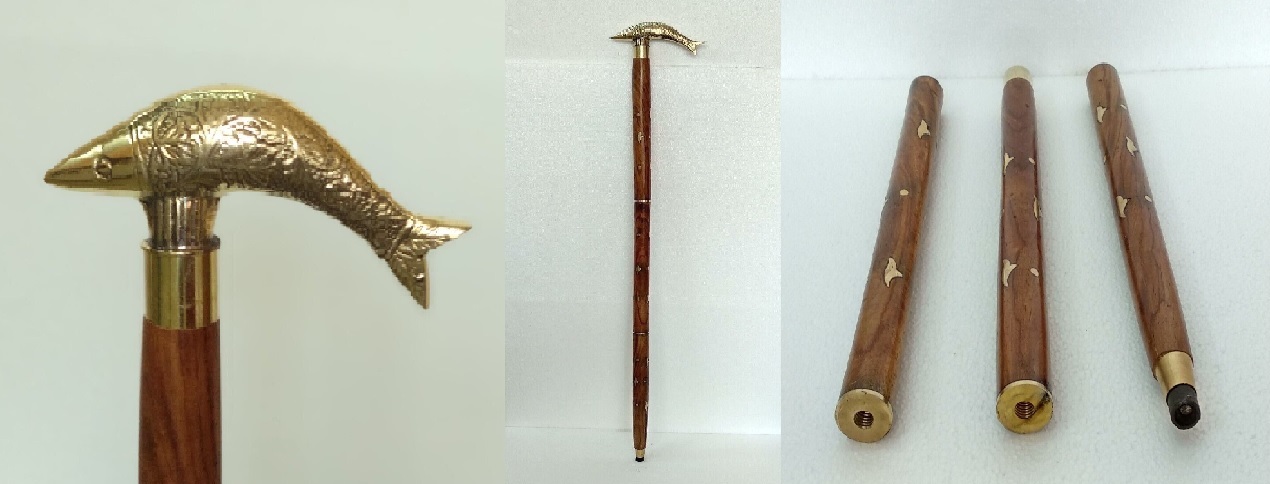 Antique Brass Designer Fish Handle Wooden Vintage Design Walking Stick