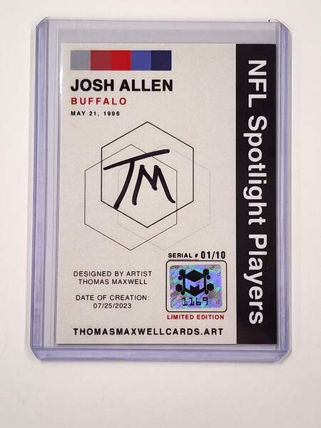 We’re excited to offer this exclusive Josh Allen Limited Edition Art Card. This unique Football Art Card numbered 1/10, showcases Josh Allen and is hand-signed by the artist and affixed with a numbered hologram adding an extra layer of authenticity.