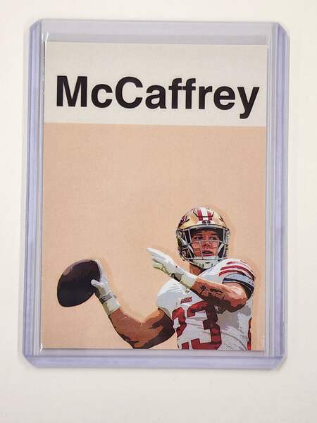 The card features a beautifully detailed depiction of Christian McCaffrey in action. The artist's meticulous attention to detail and vibrant color palette make this card a treasure for any serious Football sports card collector or fan of Christian McCaffrey.