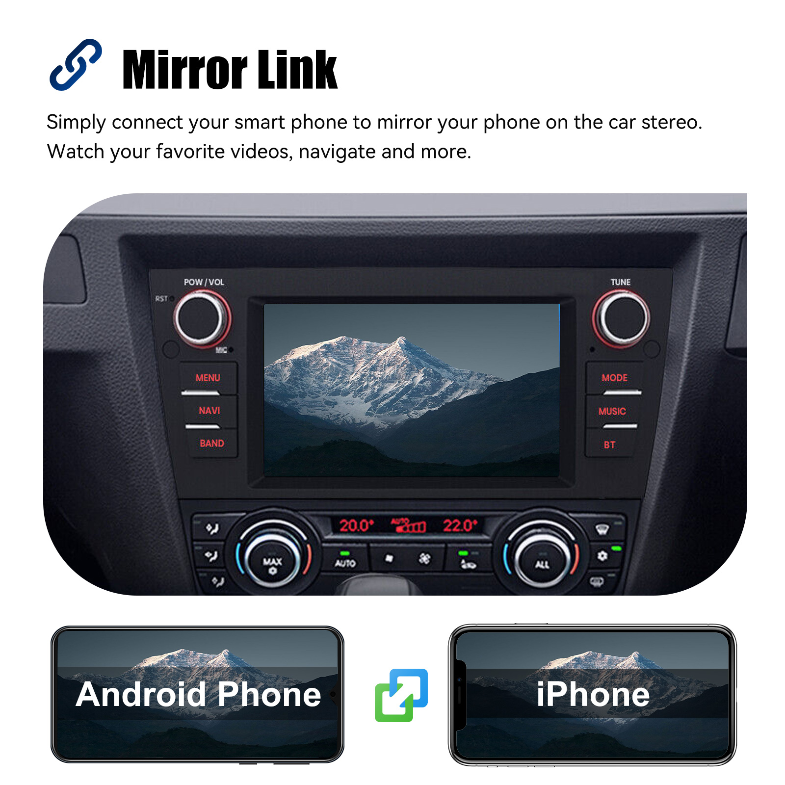 MIRROR LINK & APPLE CARPLAY & ANDROID AUTO: With this car radio, you can experience the amazing Mirror Link function, compatible with iOS and Android phones. You can mirror your smartphone screen to the car radio using apps like Google Maps, Spotify, Youtube, etc. Replace your cell phone with the car screen and turn your vehicle into a smart platform. Immerse yourself in a seamless and user-friendly infotainment experience with Apple CarPlay & Android Auto. Connect your iPhone to Apple CarPlay or your Android smartphone to Android Auto and securely access calls, texts, navigation, music and more. With intuitive operation via the touchscreen or voice control, you have all functions at your fingertips while you remain safely at the wheel. Use your favorite apps and stay connected at all times while keeping your eyes on the road. Turn your vehicle into an extended hub for your mobile devices and experience a new dimension in infotainment.