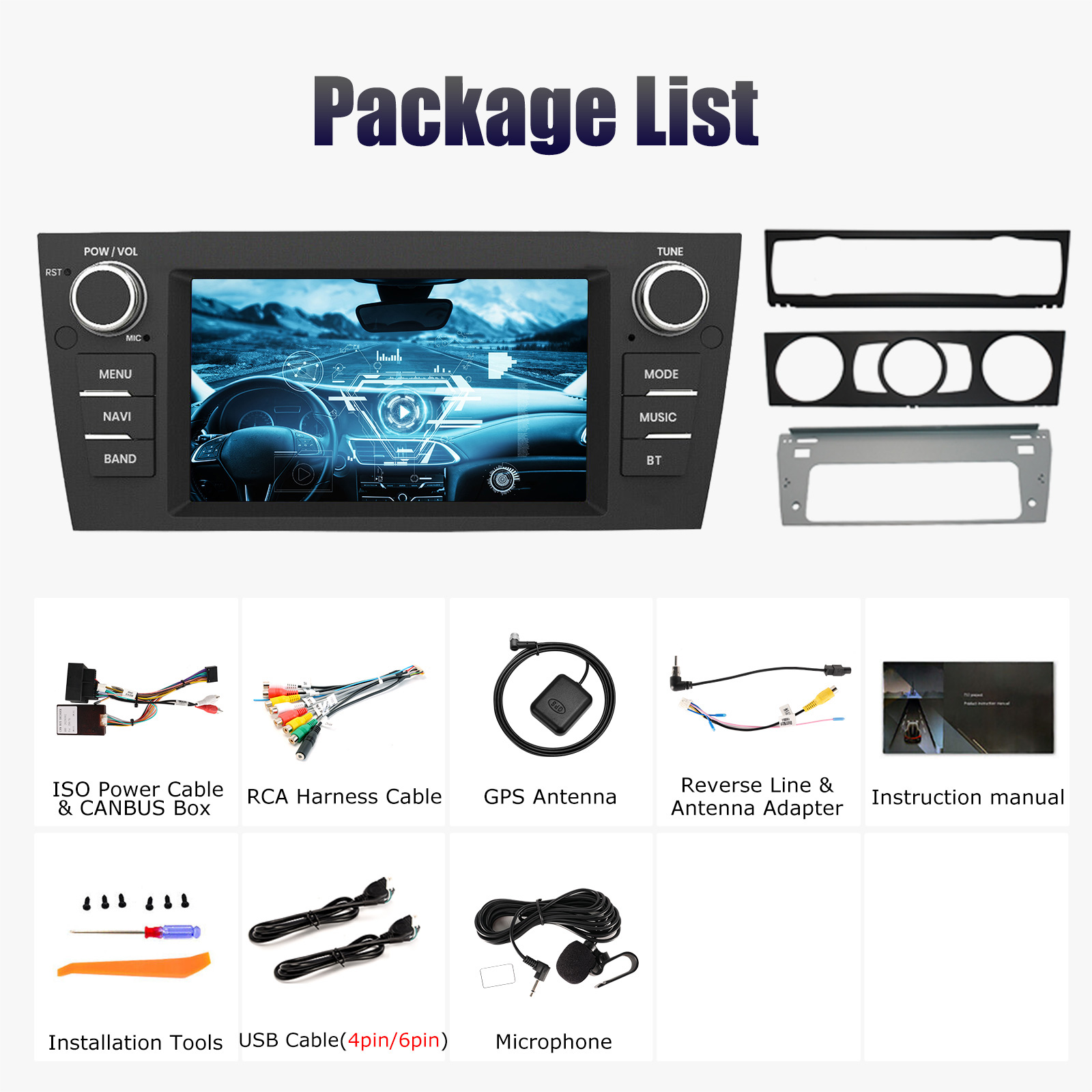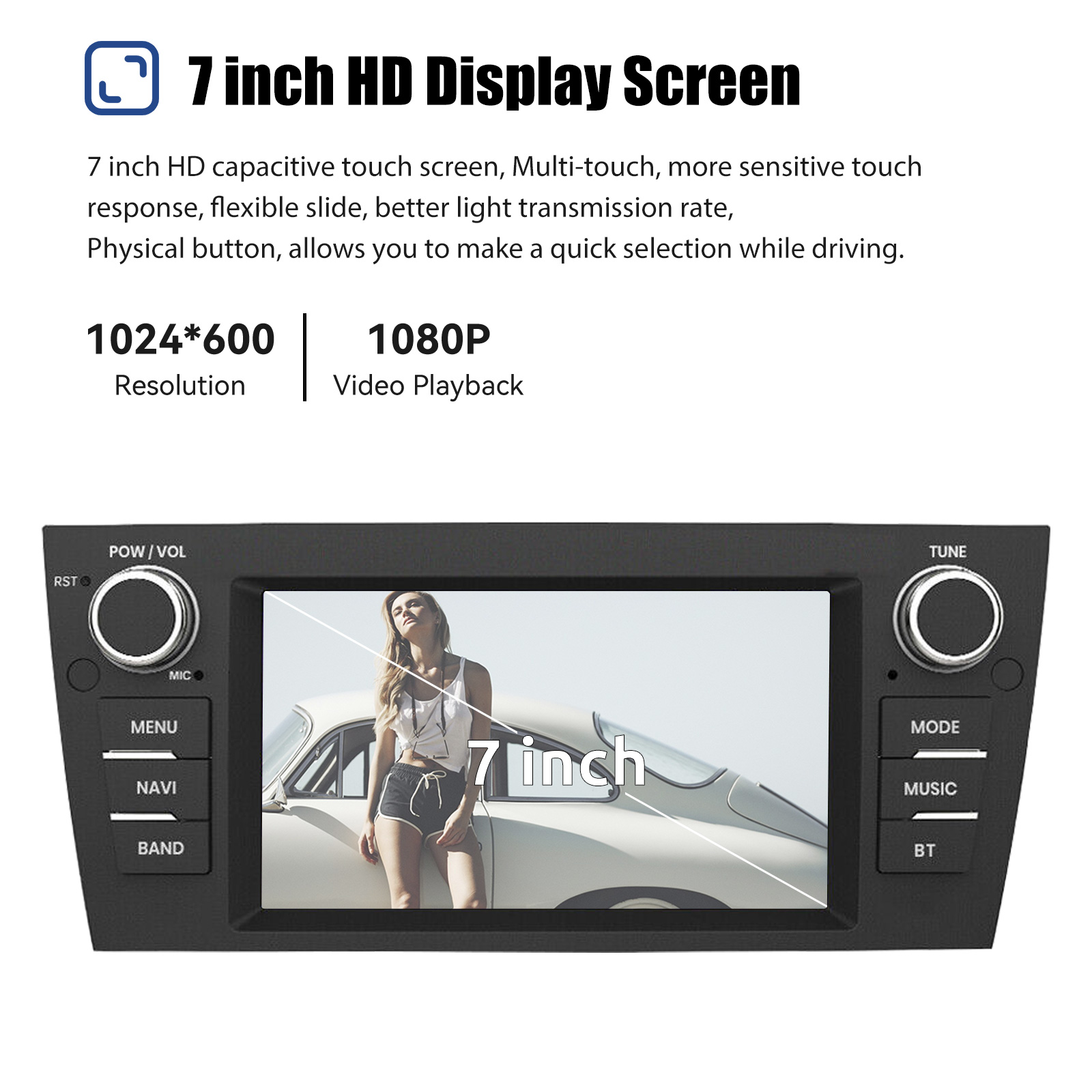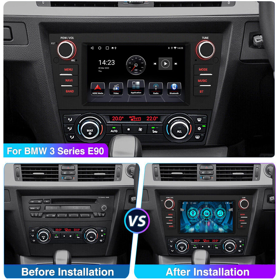 7 Inch Android 13 Car Radio For BMW 3 Series E90 E91 E92 E93: The Android car radio with 7" 1024*600 HD capacitive touch screen, 2GB RAM and 64GB ROM allows you to download your favorite apps and videos, so that driving will never be boring .No additional frame, no cable change, plug and play.