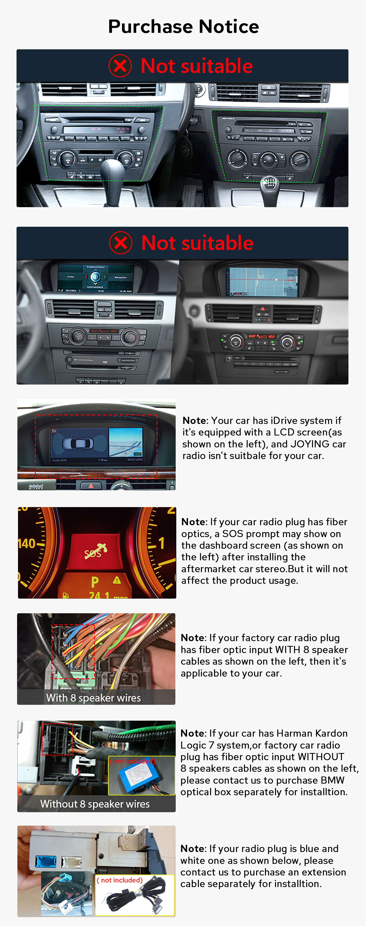 Kindly verify if your car is equipped with a fiber optic power amplifier. If your car has this feature, our products may not be compatible, and you may require additional accessories. If you are unsure, please don't hesitate to contact our dedicated customer service team.